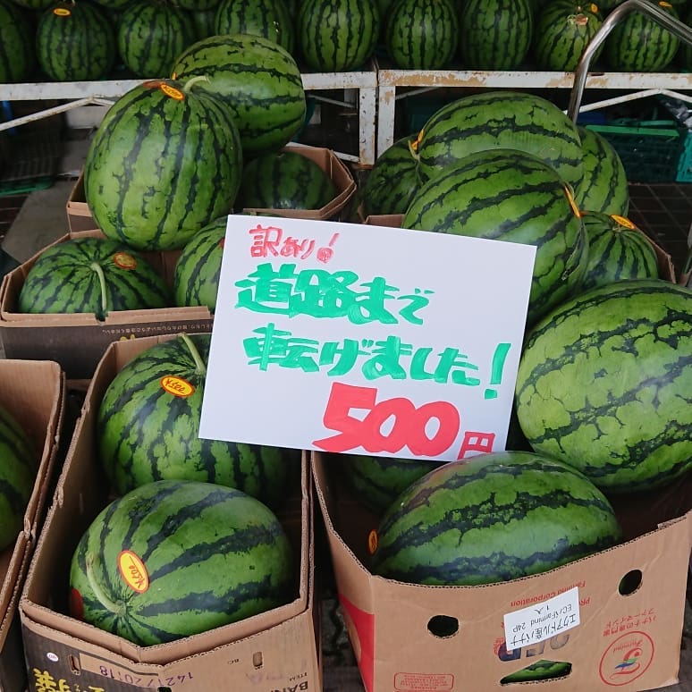 - ≪尾花沢すいか≫ 今朝も山のような出荷️(市場) なんとお店並べ中にひと山崩れて 道路にまでゴロゴロ~️ 転げたスイカは緊急値下げ️ 半額以下の500円ワンコイン️