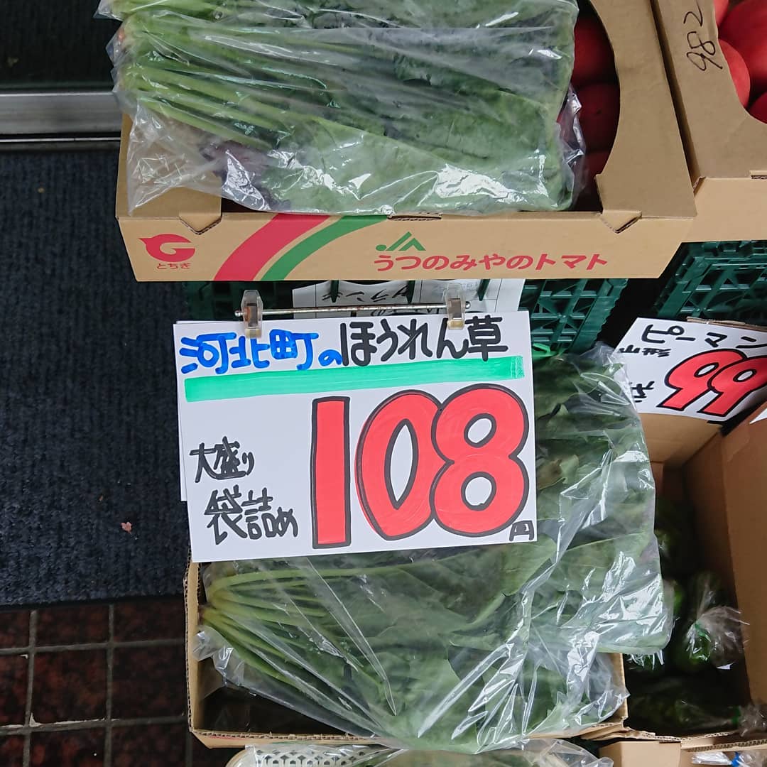 河北町吉野の「ほうれん草」 大袋入りで108円️ トマトの箱に匹敵しそうなボリュームですね。 View this post on Instagram A post shared by Shigemi Satou (@s.shigemi) Posted by Intagrate v1.9.7