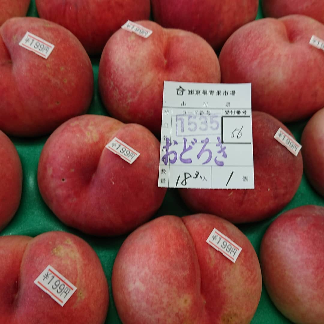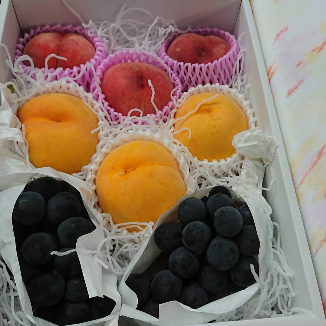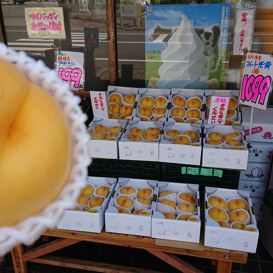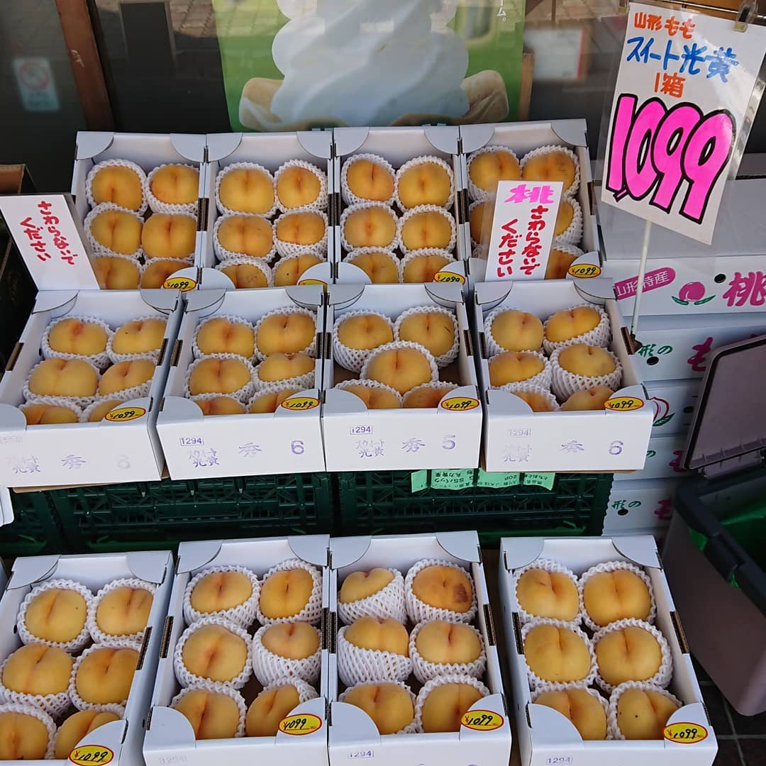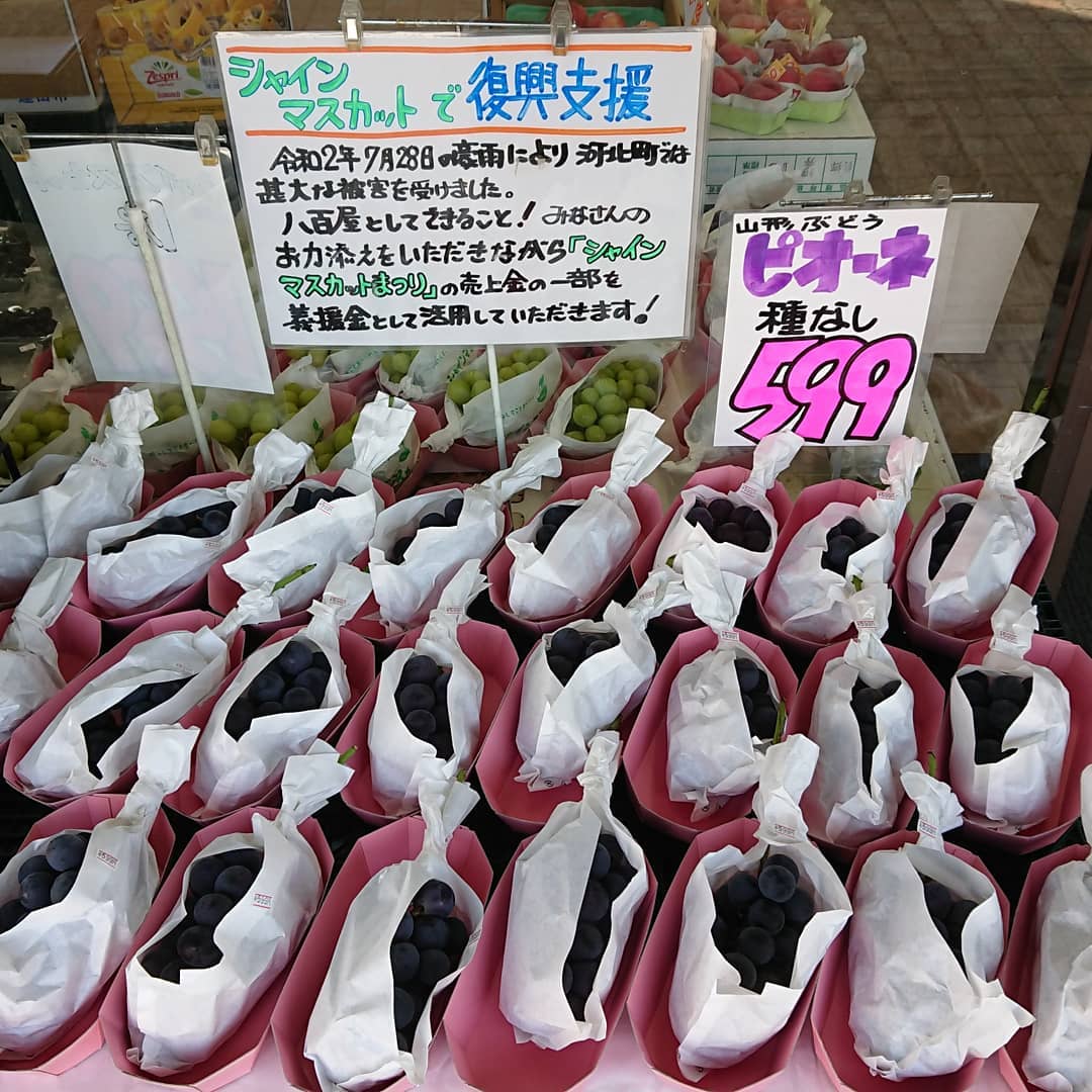 ≪シャインマスカットで義援金️≫ シャインマスカットの売上金の一部を義援金として河北町に活用していただきます。 軸もピカピカだ~ ギフトにもバッチリスタンドパック入り~️ ≪種無しピオーネ️≫ とってもお手軽1房599円️ ≪尾花沢スイカ大量入荷~️≫ オバネのスイカは終盤戦️ 今朝、100個近く競り落としました。 ≪固くて甘い桃≫ スイート光黄は箱売りで~️ ≪ジャンボな超特大アボカド️≫ レギュラーと同じ値段で登場~️ ≪固い桃 ≫ それは『おどろき』 ≪フルーツギフト≫ ジャスト3,000円️