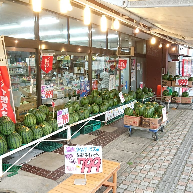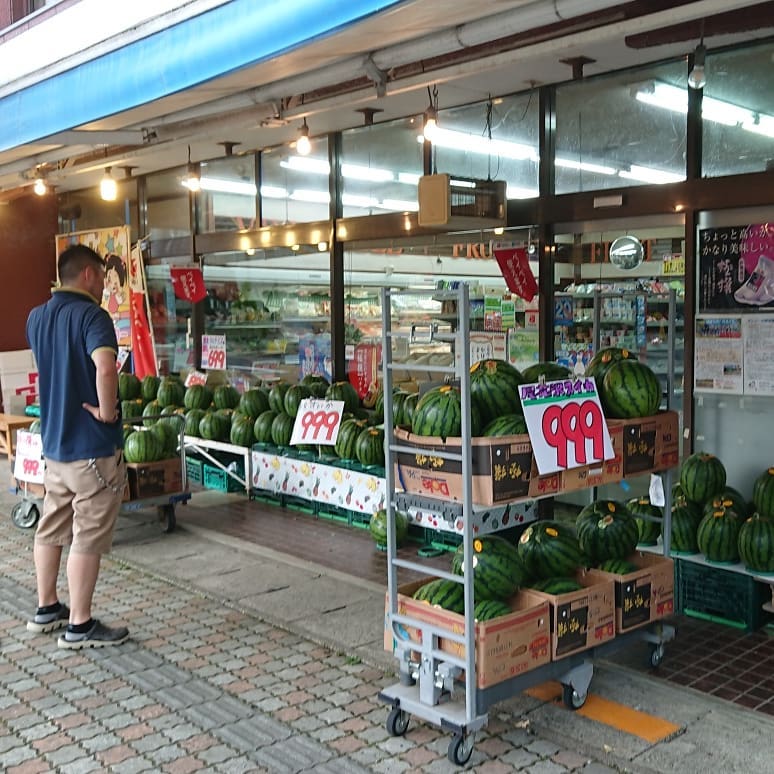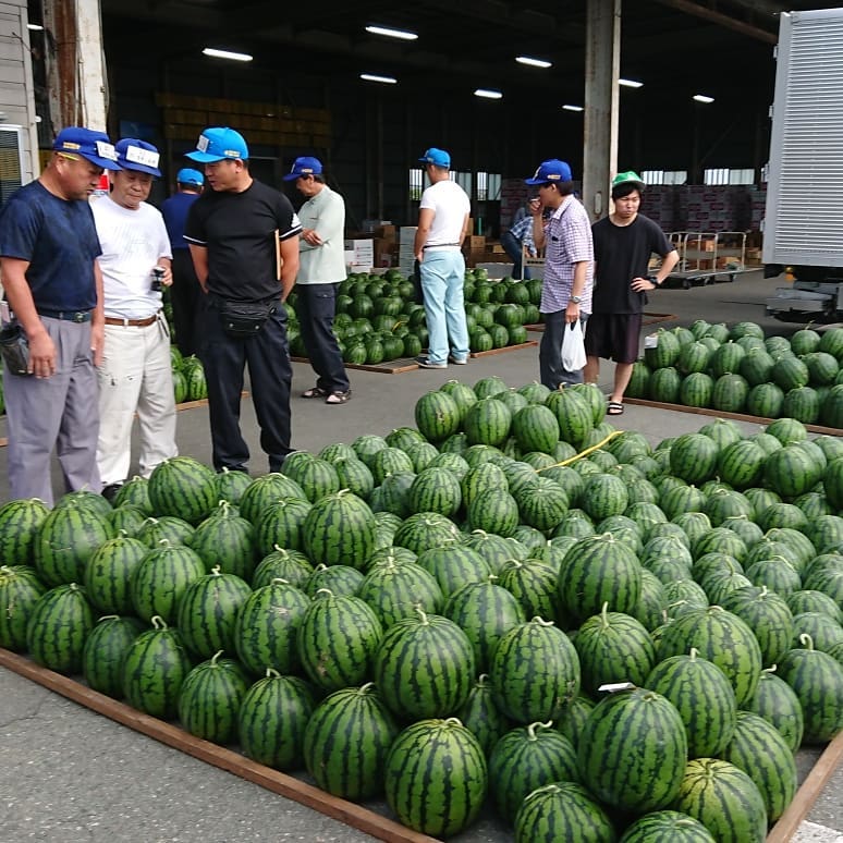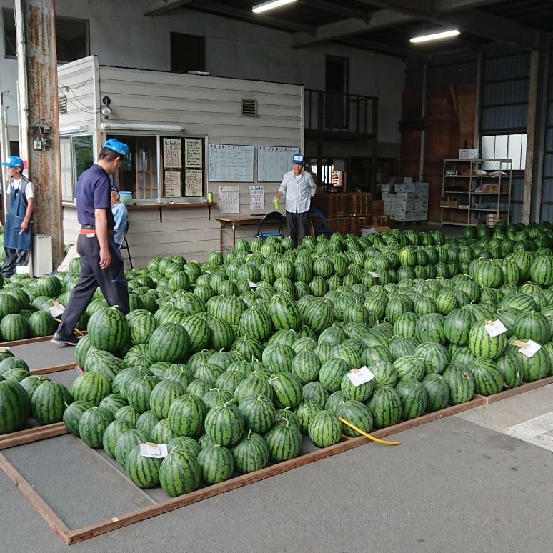 - ≪尾花沢スイカ≫ スイカは大きいほど美味しいの?さあてどうなんでしょう️ チョコバナナはアートだ。デコシャルはみんなの笑顔のために~️ 今朝の市場の様子です。スイカが駐車場にまではみ出してきています。