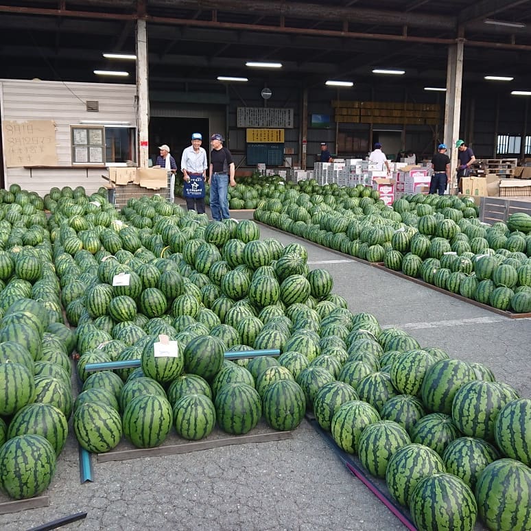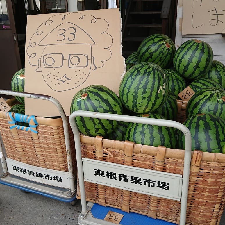 ≪尾花沢スイカ≫ 大量に競り落としたはいいが、積みきれず、積み込み2回戦に市場にきたら、クラッカーへの歓迎看板がありました。