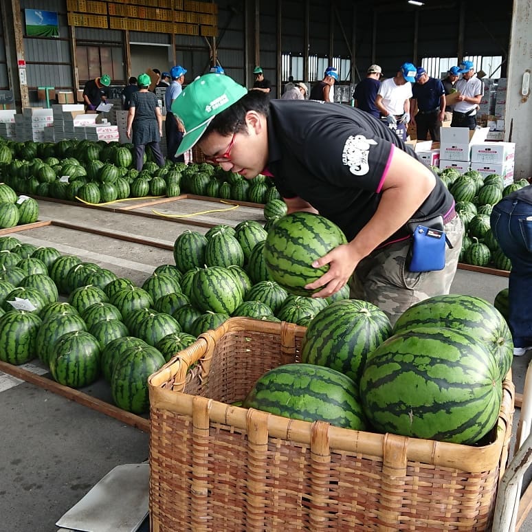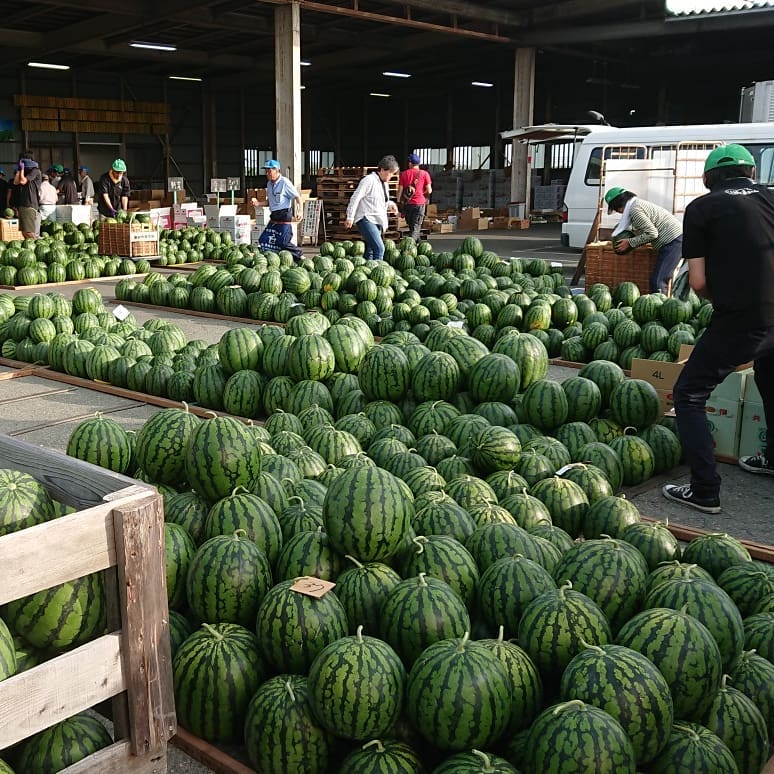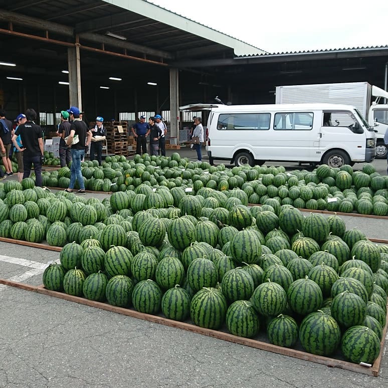 - ≪尾花沢スイカ️≫ デカくて美味しそう~️ 市場の駐車場にまでスイカがいっぱい クラッカー 河北町クラッカー 尾花沢スイカ