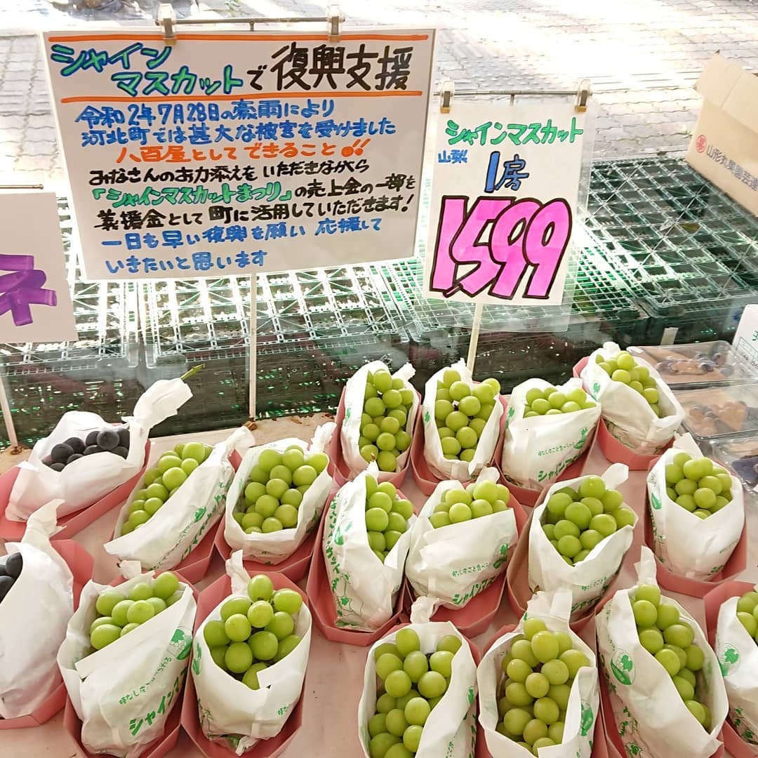 【シャインマスカットで復興支援】 令和2年7月28日の豪雨により 河北町は甚大な被害を受けました。 八百屋としてできること️みなさんのお力添えをいただきながら『シャインマスカットまつり~️』の売上金の一部を義援金として町に活用していただきたいと思います。 一日も早い復興を願い 応援をしていきたいと思います。