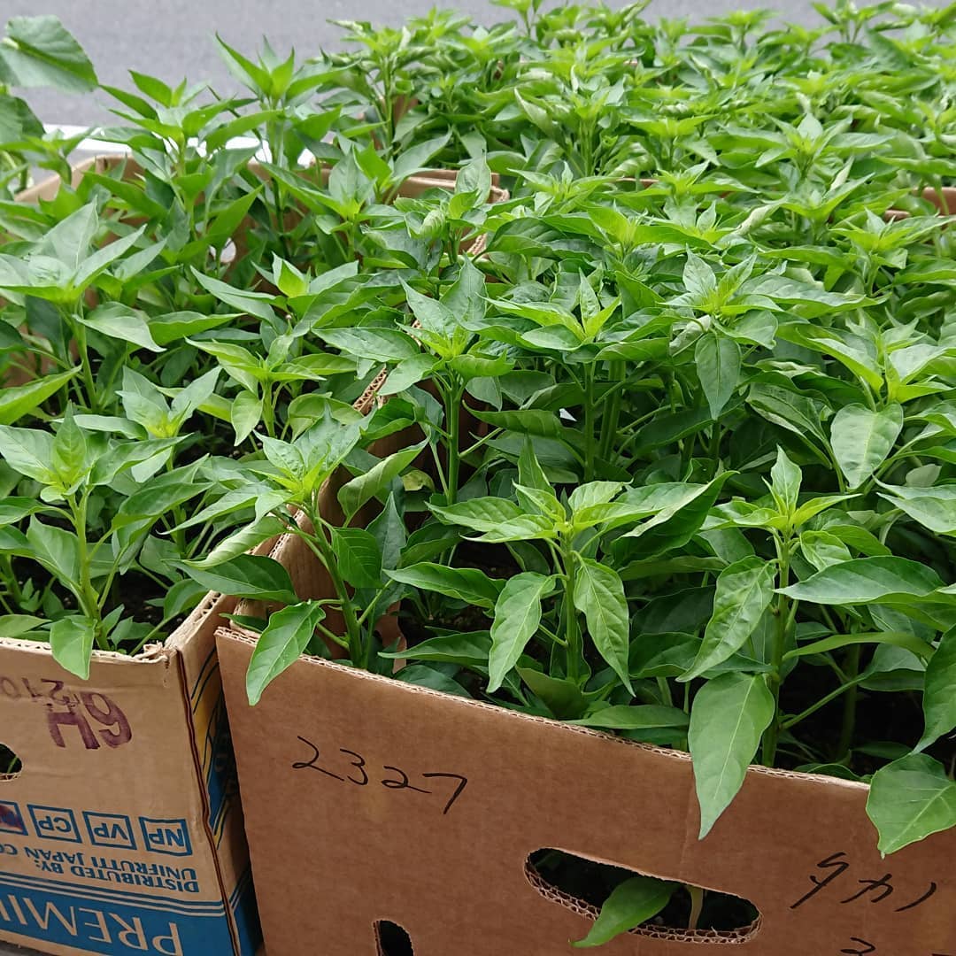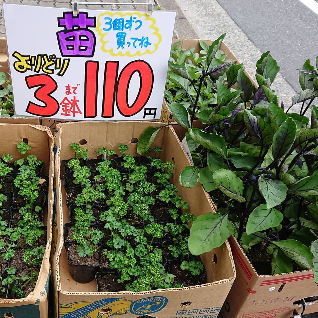 【価格変更】 苗は消費税が10%なので3鉢110円になります。 苗事業から撤退のはずでしたが、我慢できずに仕入れてしまった️ 鷹の爪、都プリンスメロン、パセリ、ナス、オクラ、チマサンチュ、モロヘイヤという顔ぶれです。