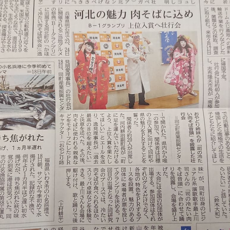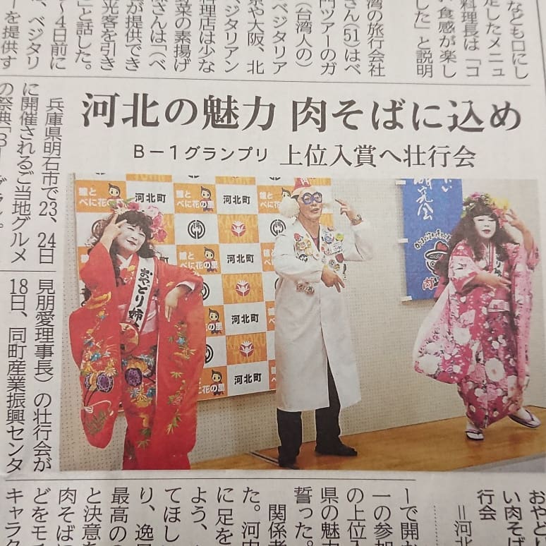 - 【河北の魅力 肉そばに込め】 今朝の山形新聞に壮行会の記事が出ていました。今週末、兵庫県明石市で行われる『Bー1グランプリ』に参加して河北町、山形県をPRしてきますよ~️