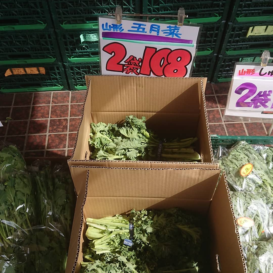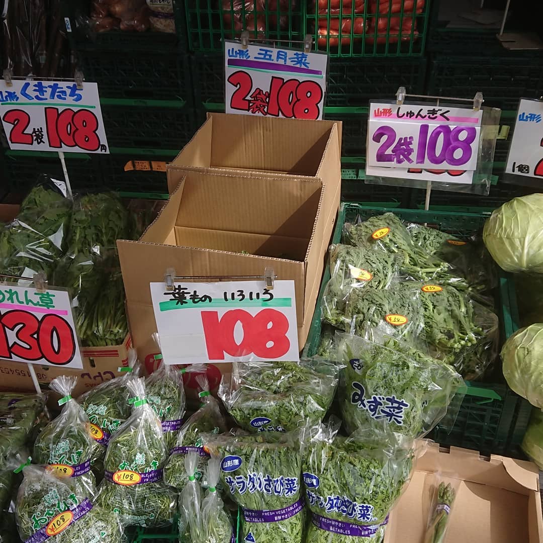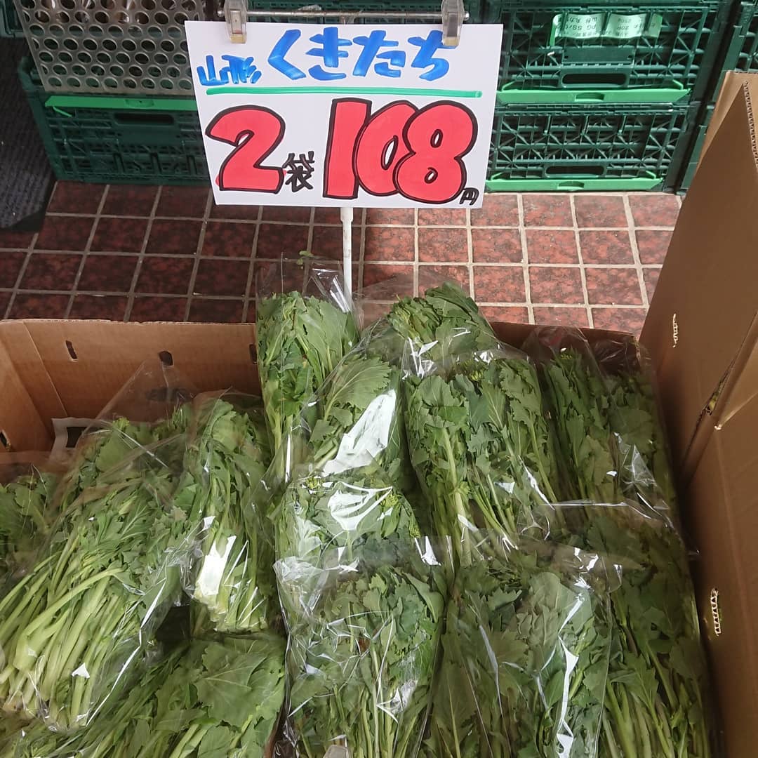 【葉もの108円均一️】 くきたち2束、五月菜2束、おかひじき2袋、サラダわさび菜3袋、水菜2袋それぞれ108円 明日水曜日は店休日なのです。 みうら食品の鳥中華が小刻みに入荷しています。 久々に『レンジでチン インカの目覚め』入りました。