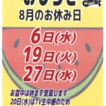お知らせ 8月のお休み日 8/6(水) 8/19(火) 8/27(水) お盆中は休まず営業します。 20日は水曜日ですが、TV生中継のため営業いたします。(TBS東北放送「ひるまでウォッチン!」向かいにある動物園の生中継ですが、当店のスイーツまで足を延ばしていただけるようです。am10:56〜ミッチーチェンさんのコーナーです。