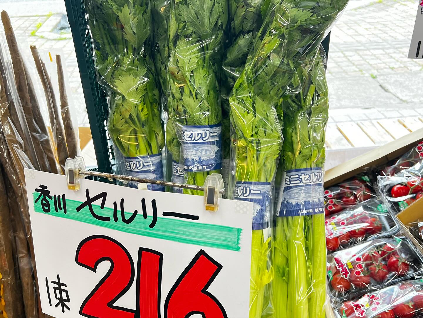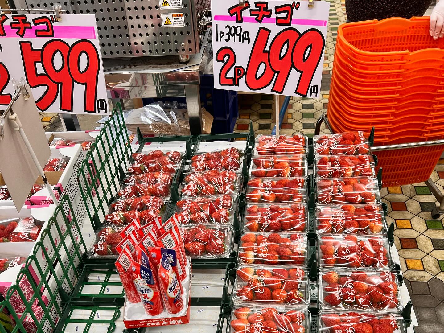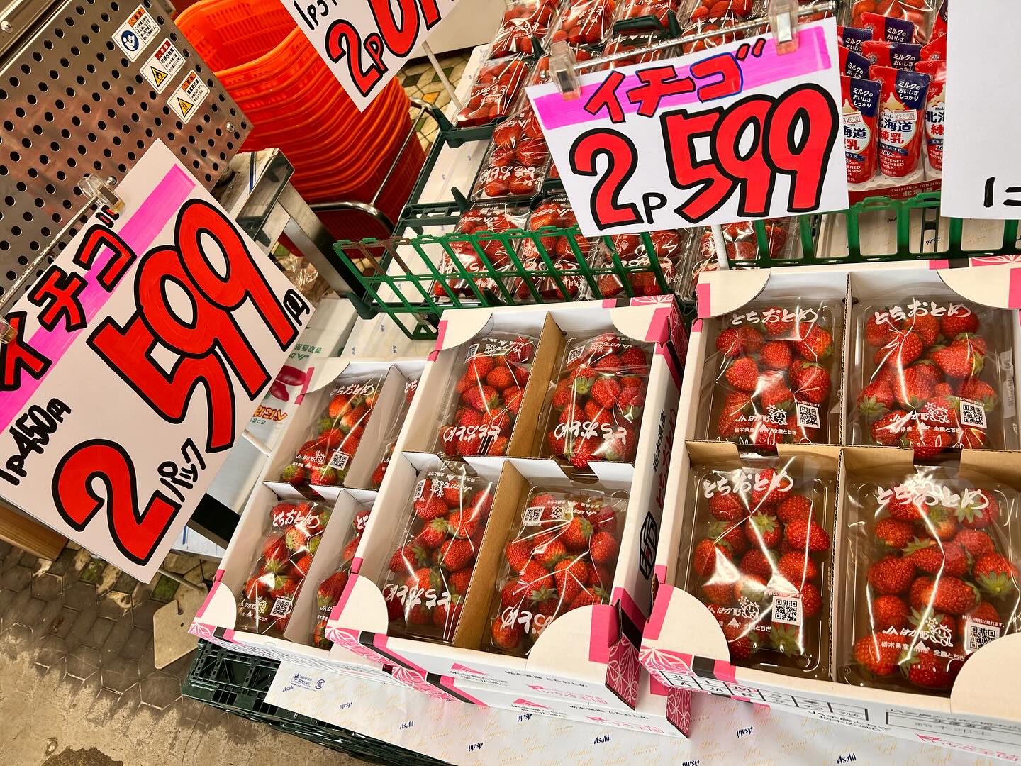 イチゴ2パック599円と2パック699円 台湾バナナにフルーツサンド、チョコバナナ セロリもお手頃価格ですね。