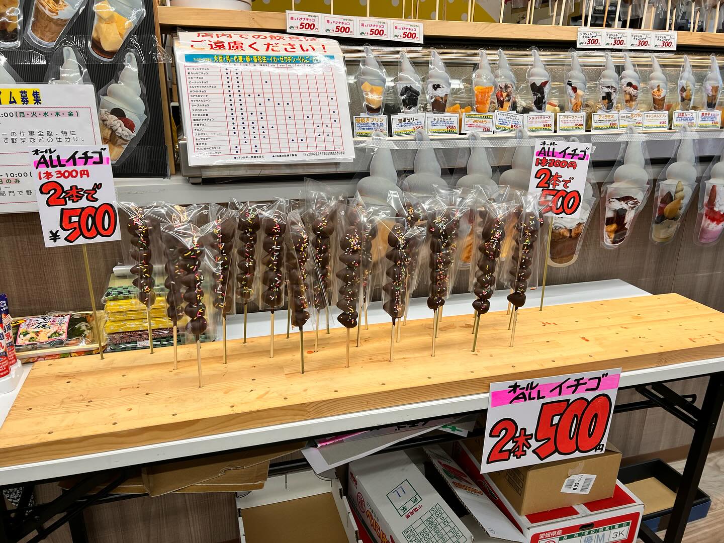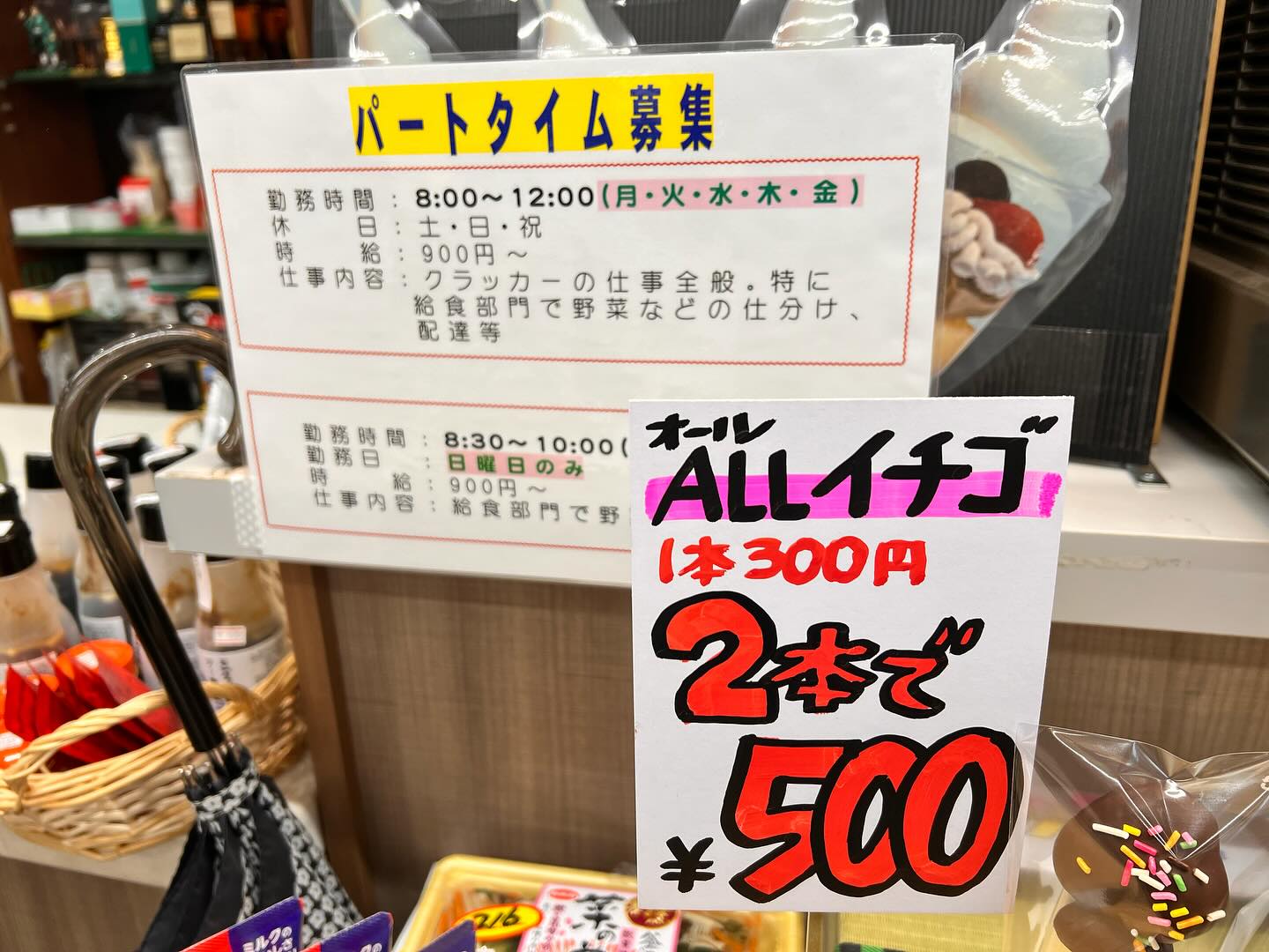 - イチゴ2p 599円 & 2p 699円 キャベツ299円 オールイチゴチョコ2本で500円 スタッフ募集中!