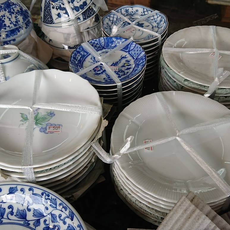 ガレージセール お蔵(倉庫)解体にともない店頭にてガレージセール️ 酒メーカーのグラスやどんぶりお皿が10円から~️ 初っぱなのお客様は『GPアンテナ』通称2段GP 超目玉品として『YAMAHAアップライトピアノ』10円でいかがですか~️