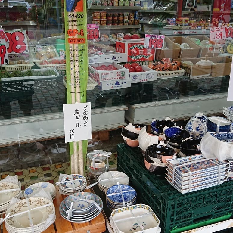 - ガレージセール お蔵(倉庫)解体にともない店頭にてガレージセール️ 酒メーカーのグラスやどんぶりお皿が10円から~️ 初っぱなのお客様は『GPアンテナ』通称2段GP 超目玉品として『YAMAHAアップライトピアノ』10円でいかがですか~️