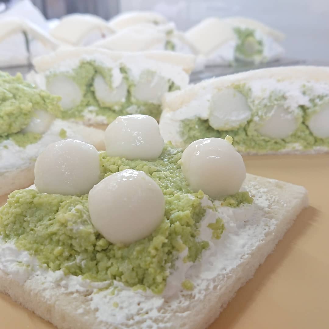 クラッカーのフルーツサンド ️ 白玉の位置をめぐって 夫婦げんか勃発 切断面に白玉があるとくっついてくるんだよね️ 母ちゃんは断面見える派 白玉ずんだ試作中~️