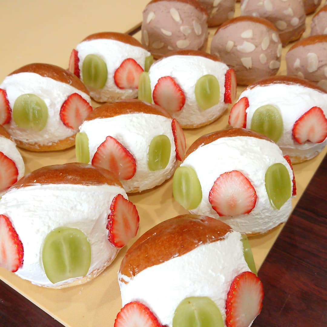 クラッカーのマリトッツォ ブリオッシュパンにフレッシュクリーム 季節の果物は 「苺とシャインマスカット」 しかもクリームの内部にも苺が隠れて入っています。 ハンバーガーのイメージがありますが、ブリオッシュという生地のパンを使っているので、ほんのり甘く軽~い食感で、「もう一個️」となりそうです。 話題のマリトッツォは全6アイテム。 ホイップは5種類 ①プレーン生クリーム ②チョコクリーム ③カスタードクリーム ④レモンクリーム ⑤マスカルポーネチーズクリーム フルーツサンド️は25種類以上~ 山梨産のシャインマスカットや山形庄内産のメロンが入荷し始めたので種類も充実してきました。 チョコバナナはアートだデコシャル️はみんなの笑顔のために~️