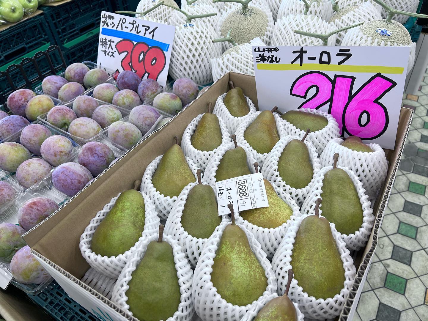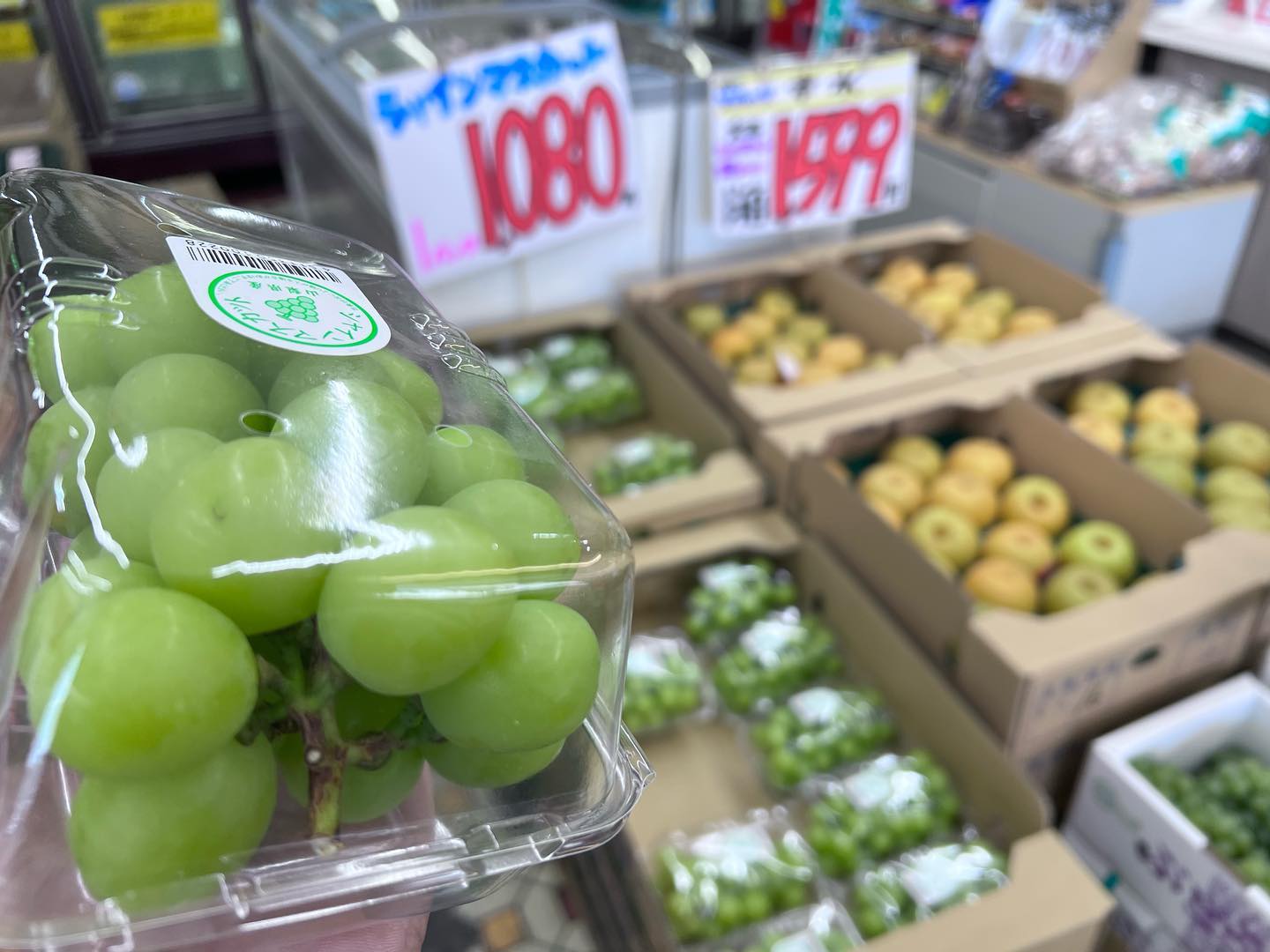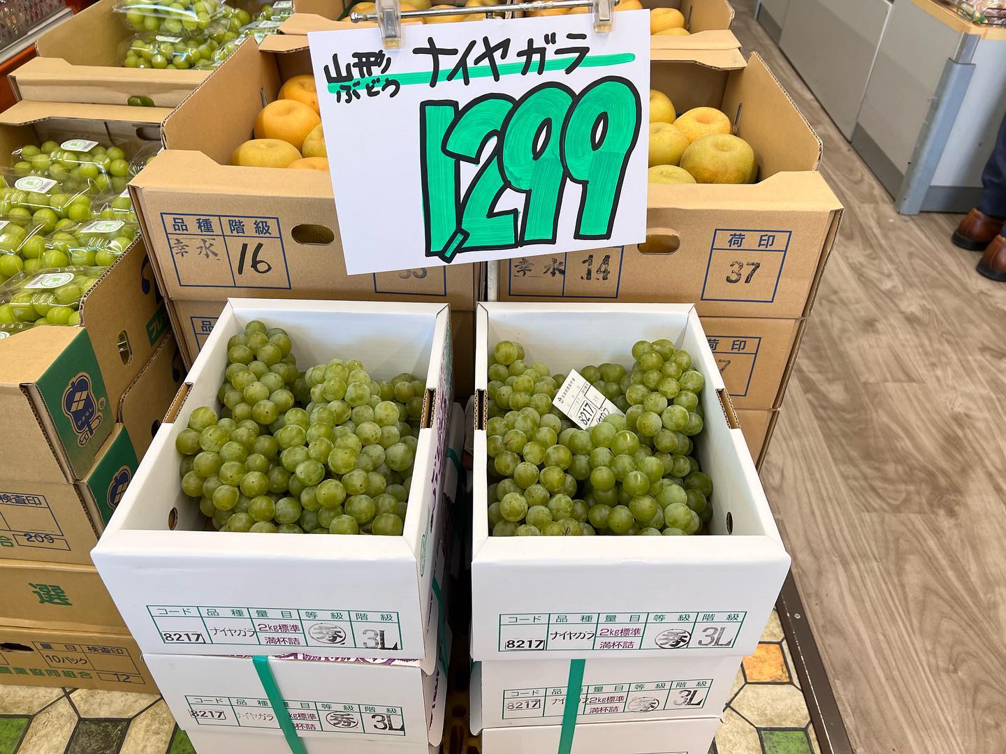 シャインマスカット 種無し皮ごと️ 1パック1,080円 山形りんご『スイートメロディー』1パック299円 お野菜の特にオススメは特大キャベツ1個108円
