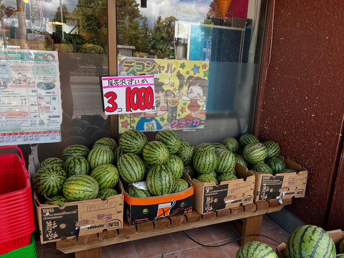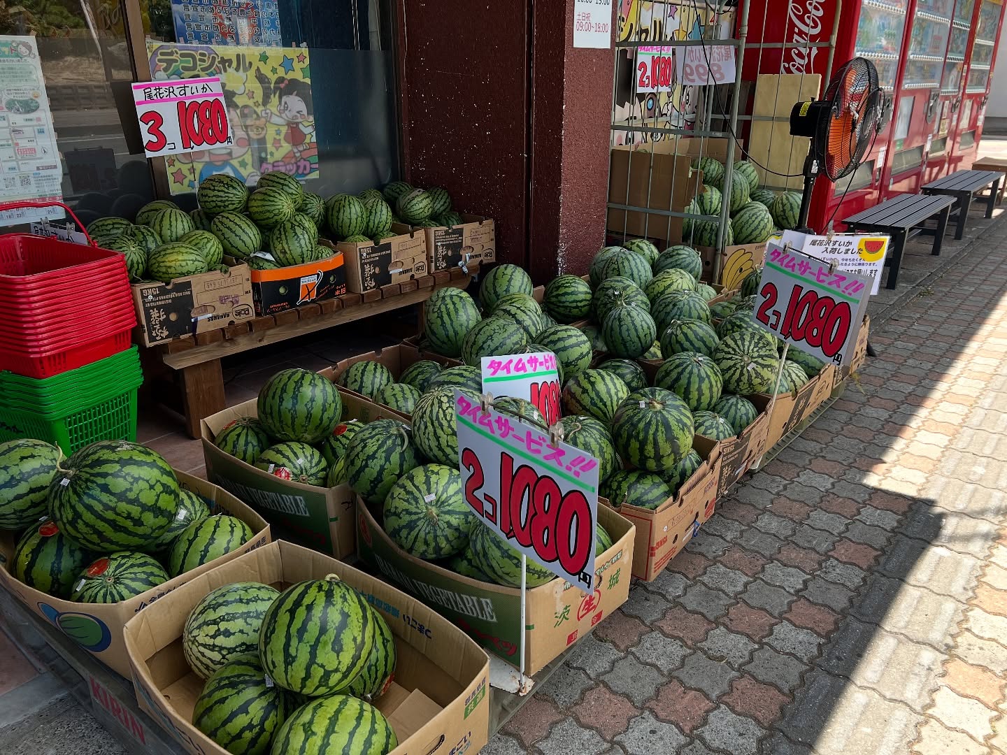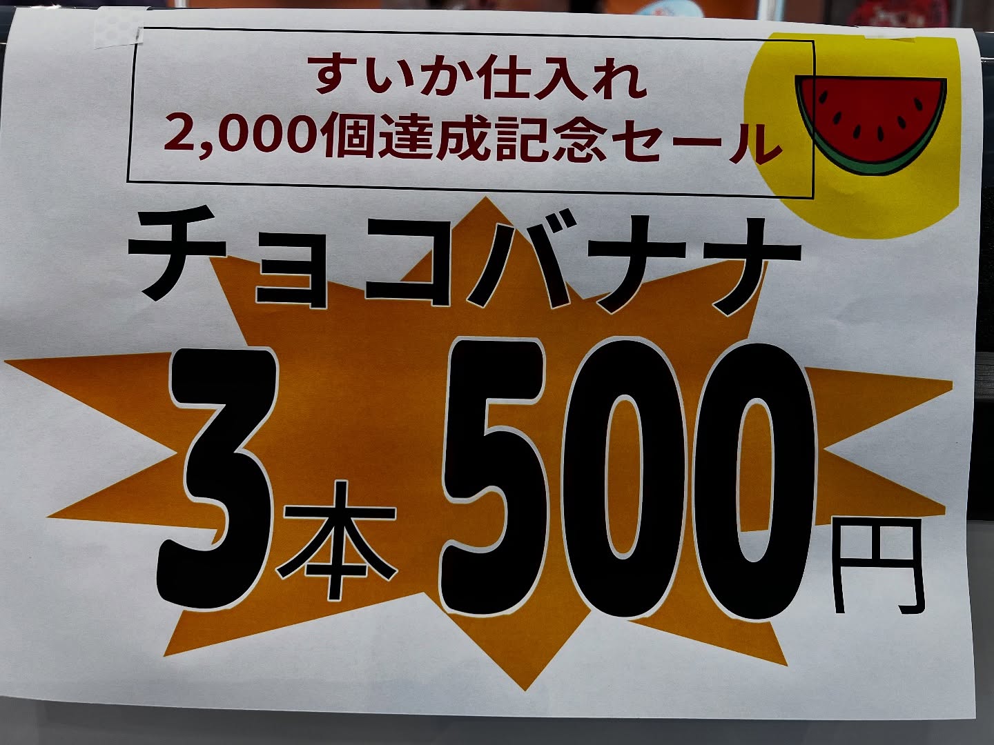 チョコバナナ3本500円 スイカ2個1,080円あります。 小玉すいか3個1,080円あります