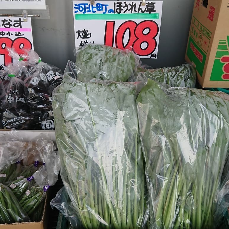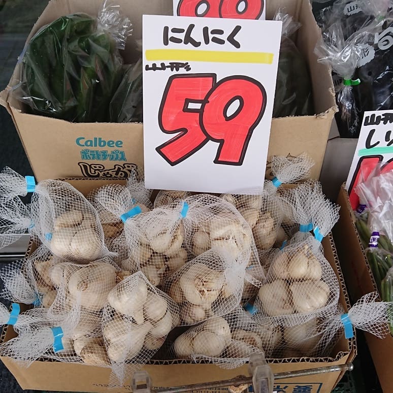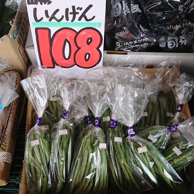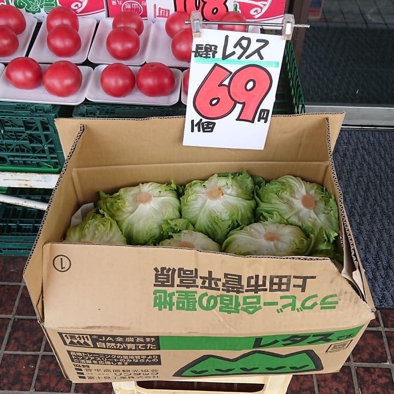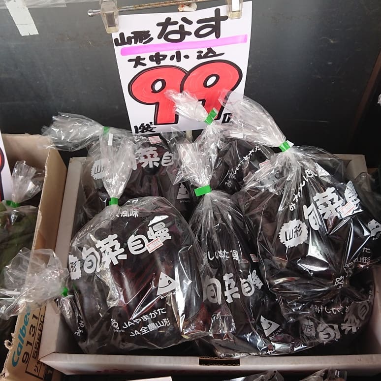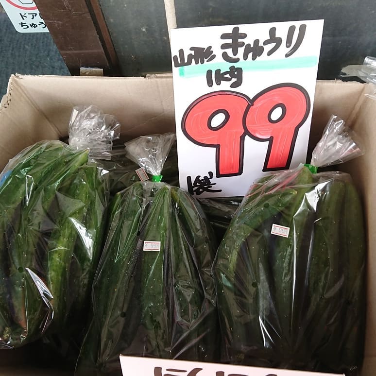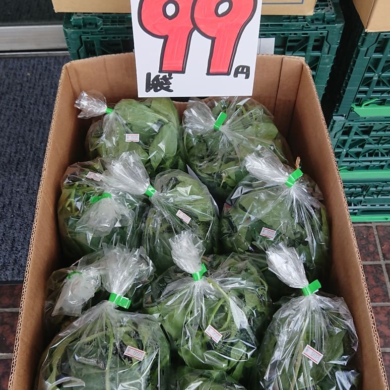 トマト箱売り~早い者勝ち なんば葉1袋99円️ レタス69円、 超目玉『山形にんにく』数個入り59円️ほうれん草大盛108円、胡瓜が1kg99円、なす(大中小込み)99円、いんげん108円