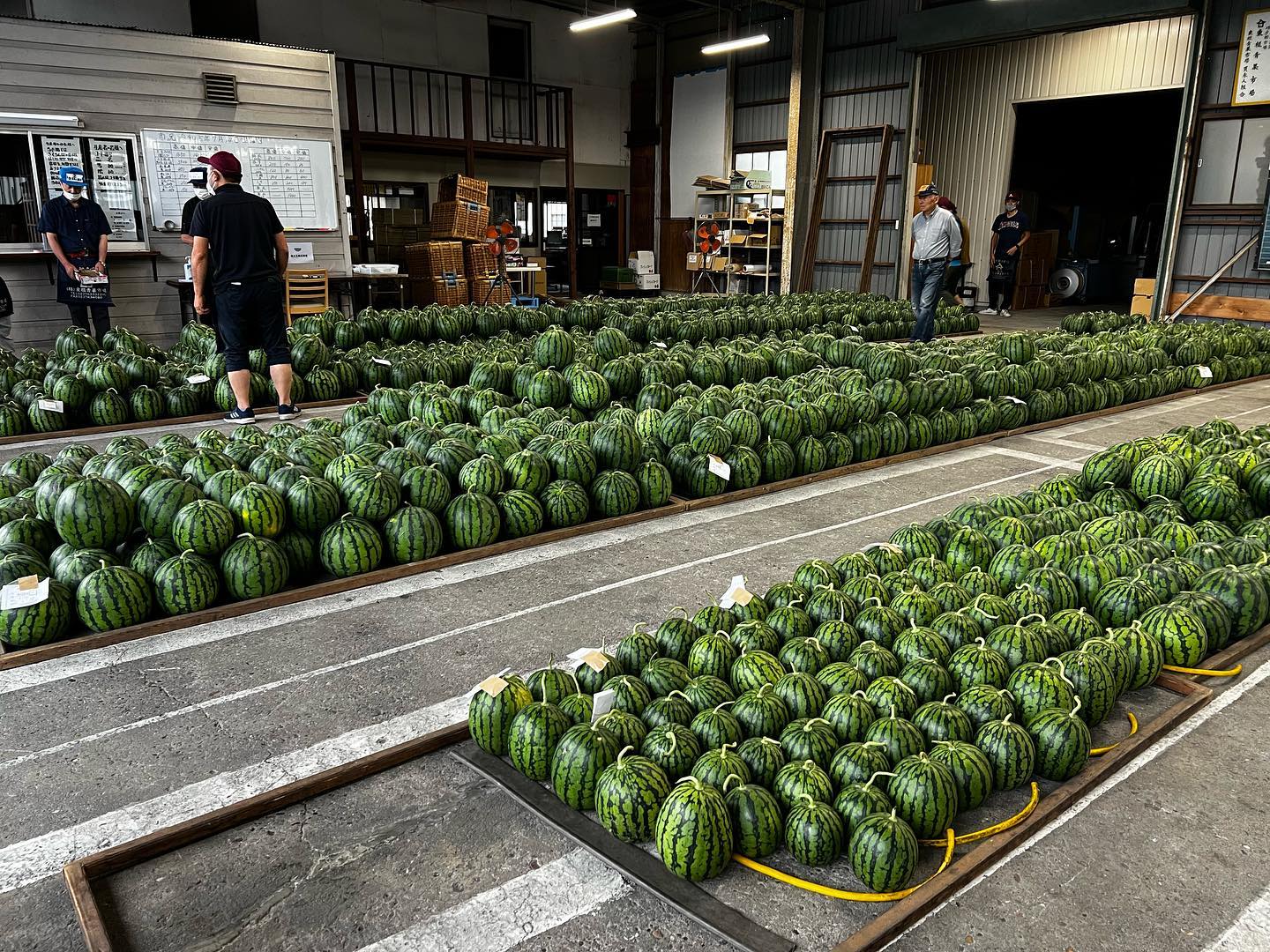 - フルーツ4種のうちのみかんは『デコポン』です。 最後の写真は今朝の市場の様子。ちょっと前まではさくらんぼでいっぱいでしたが、まもなくスイカで溢れてきます。