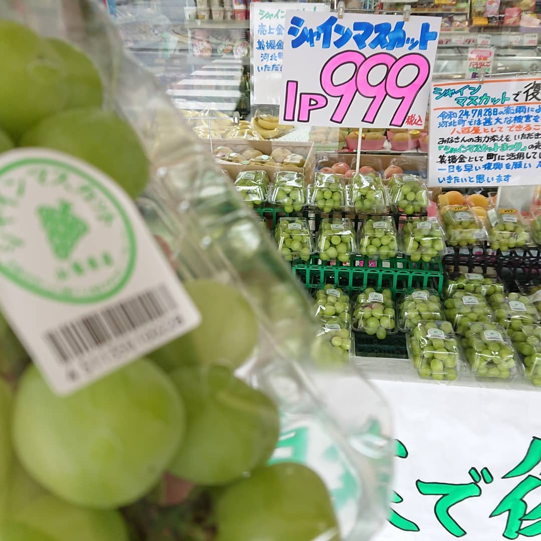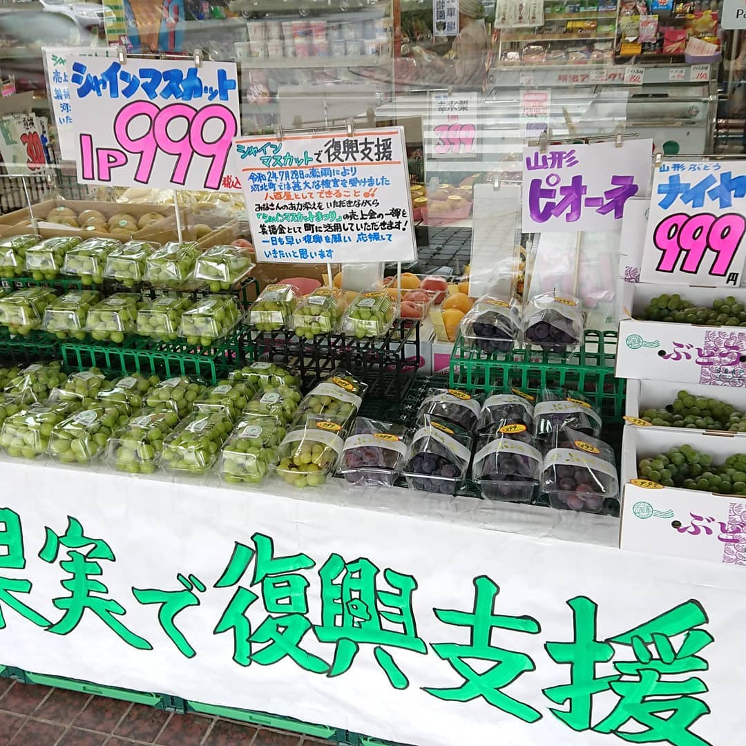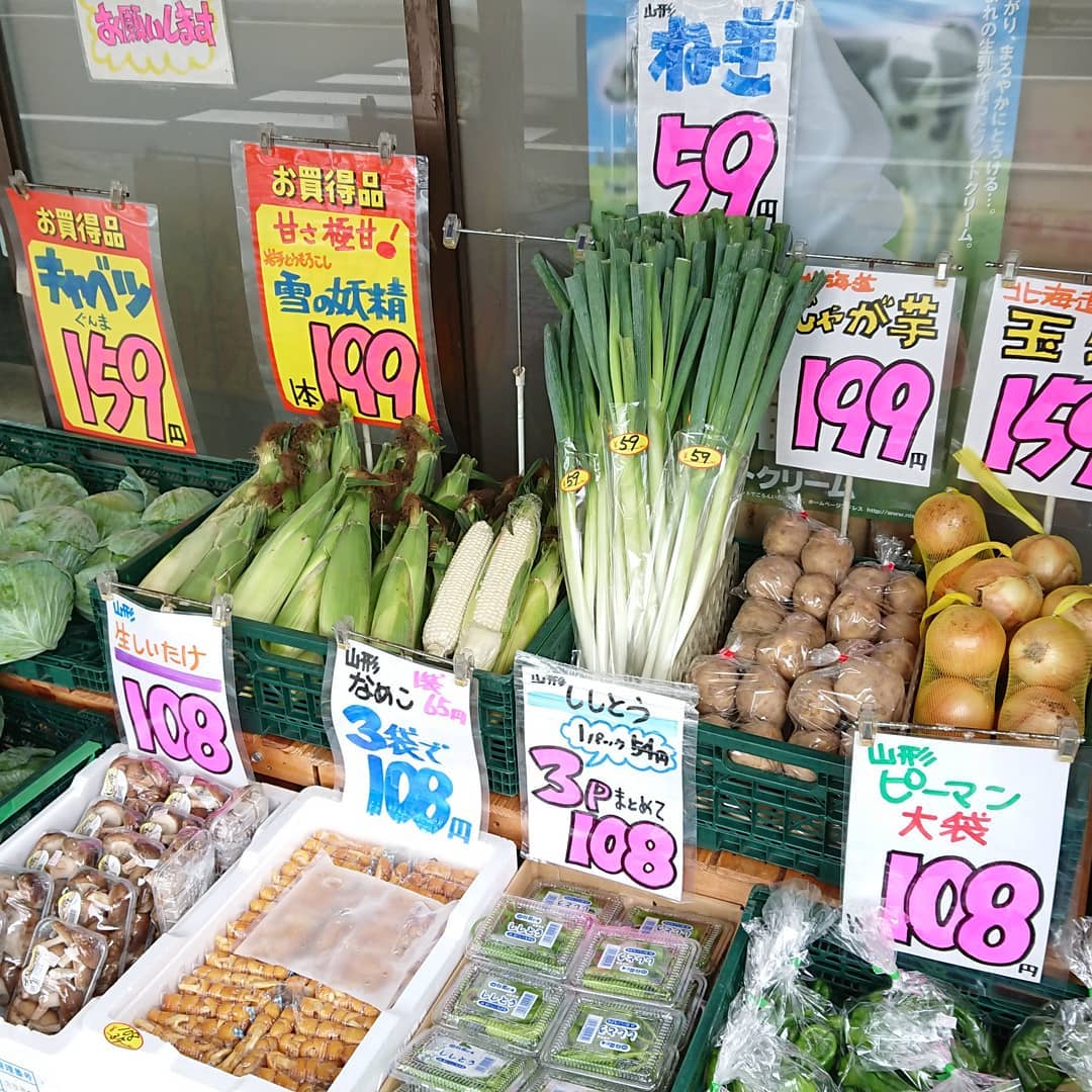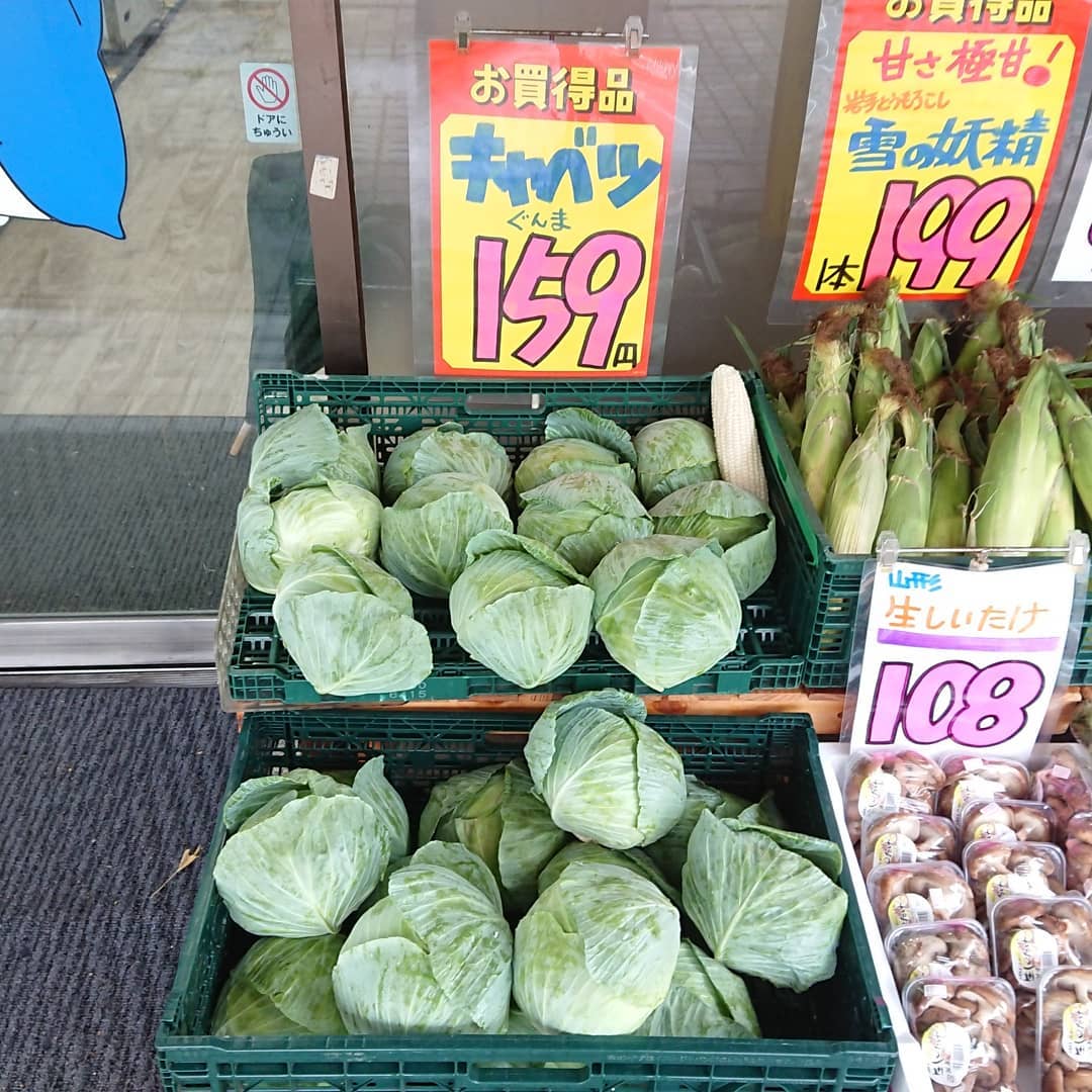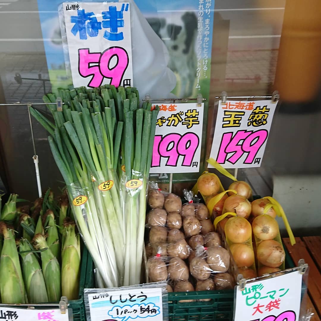 - 今日は一気に涼しくなったので、店頭に野菜を出しました~️ ️極甘甘~️の白いとうもろこし 『雪の妖精』1本199円️ スイカ 尾花沢産『富士光』 今回こそシーズンラスト入荷になるのか️ 2L~3Lの大玉が入りました。 シャインマスカット1P999円️ ?キャベツ1個159円️ ナメコ3袋108円️ ししとう3P108円️ 生しいたけ1P108円️ ピーマン大袋108円️ 玉ねぎL大サイズ4粒入り159円️ ネギ3本入り59円️ ほかいろいろ それからデコシャル️