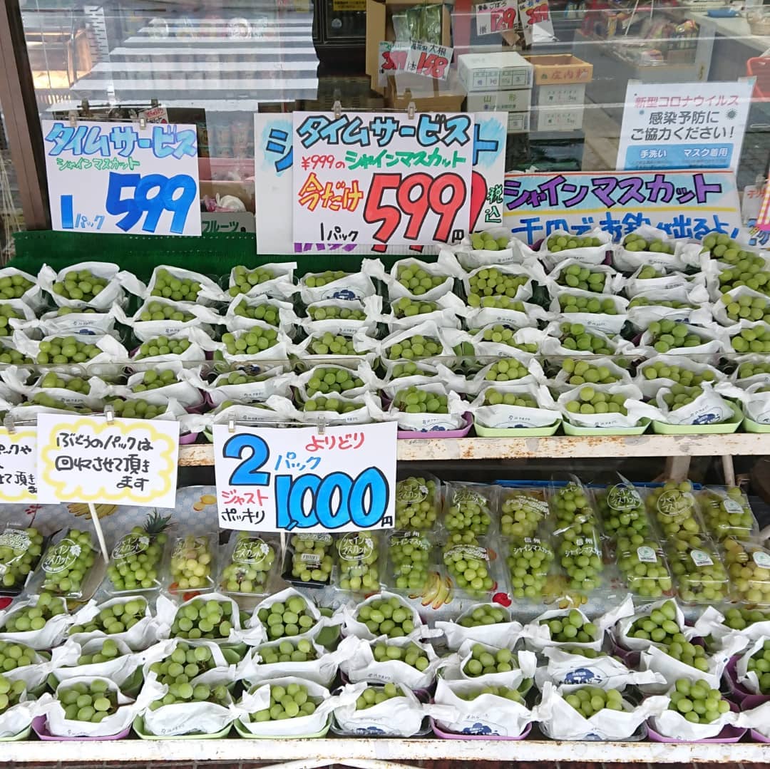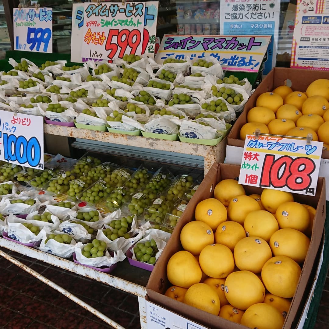 今日も目玉はシャインマスカット スポットでは ジャンボキウイフルーツ?グレープフルーツ(ホワイト)、キャベツ69円、レタス79、カブ79等々️ チョコバナナはアートだデコシャル️はみんなの笑顔のために~️