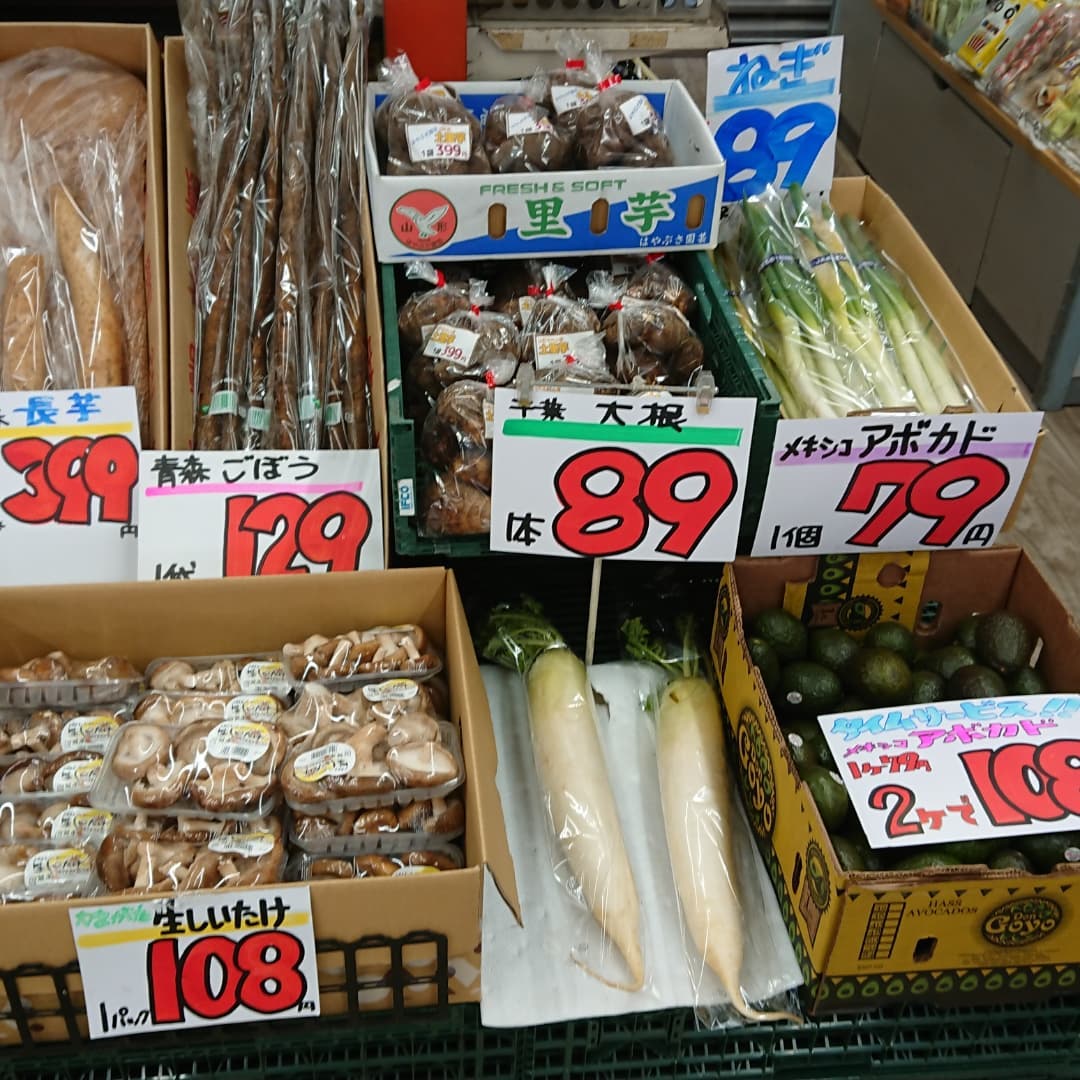 大根1箱<デコシャル️ 今日もチョコバナナよりも大根1箱が安い えのき祭り5袋108円 この週末も祭りだ祭り️️ 【タイムサービス】 アボカド2個108円1個は79円です。