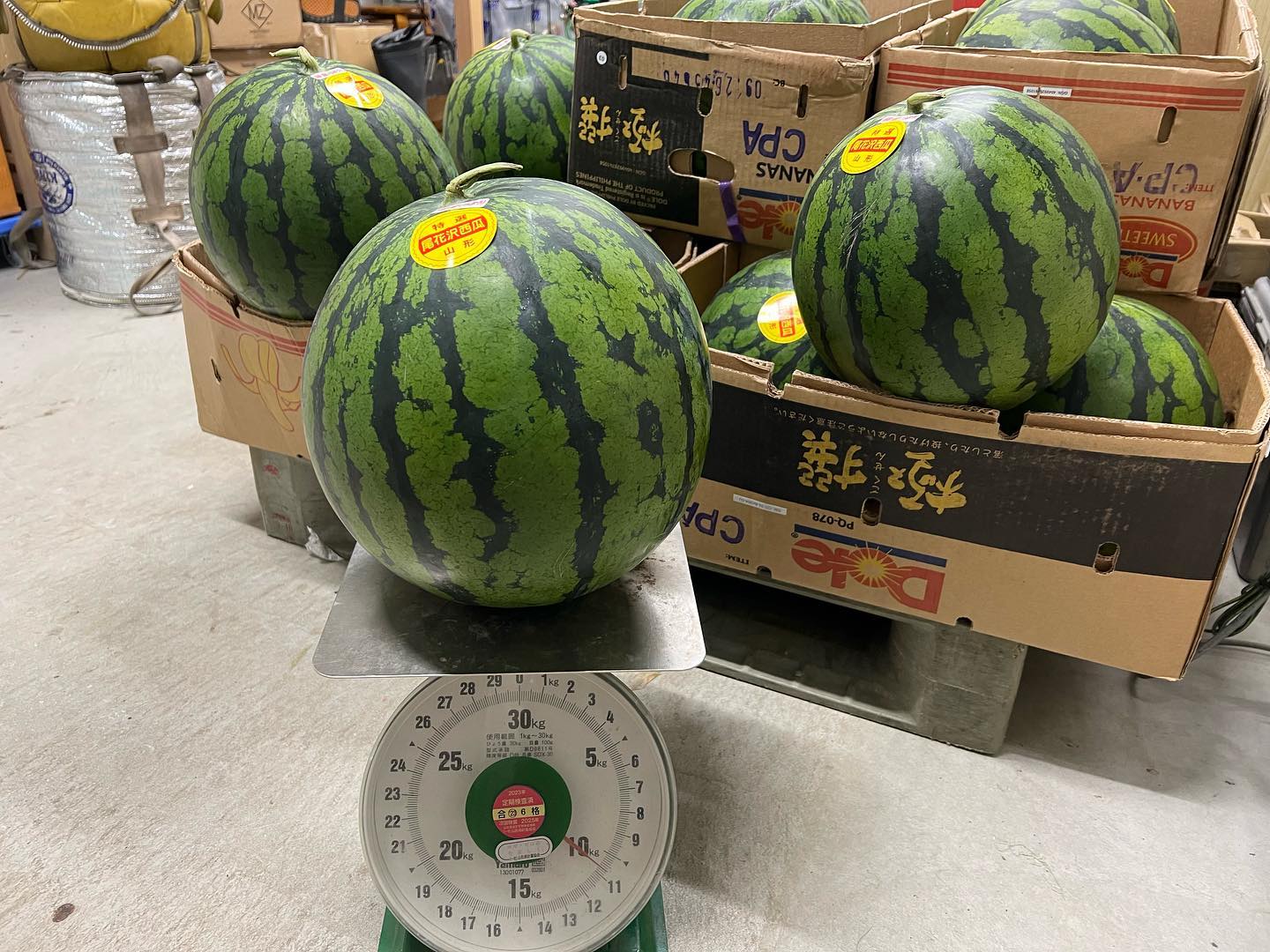尾花沢スイカ 『羅皇』 当店がもらっている生産者の羅皇が最終出荷になりました。10kgを超える特大サイズたち。限定40個の入荷です。(特大以下の大サイズ、中サイズなどはそこそこ数はあります。) 最終と言っても別品種はまだまだ出てきますからご安心を️ 2023、07、29