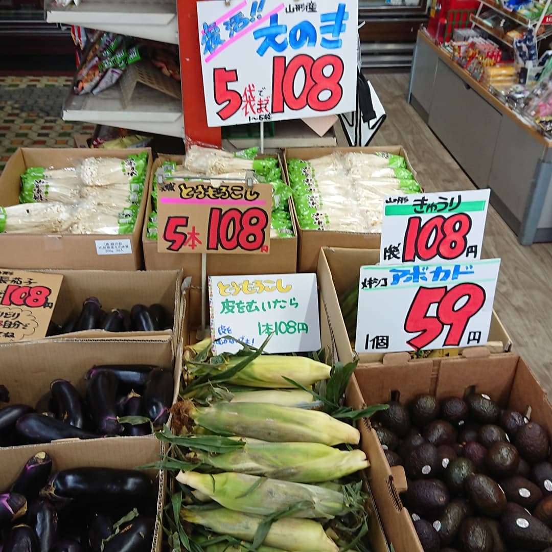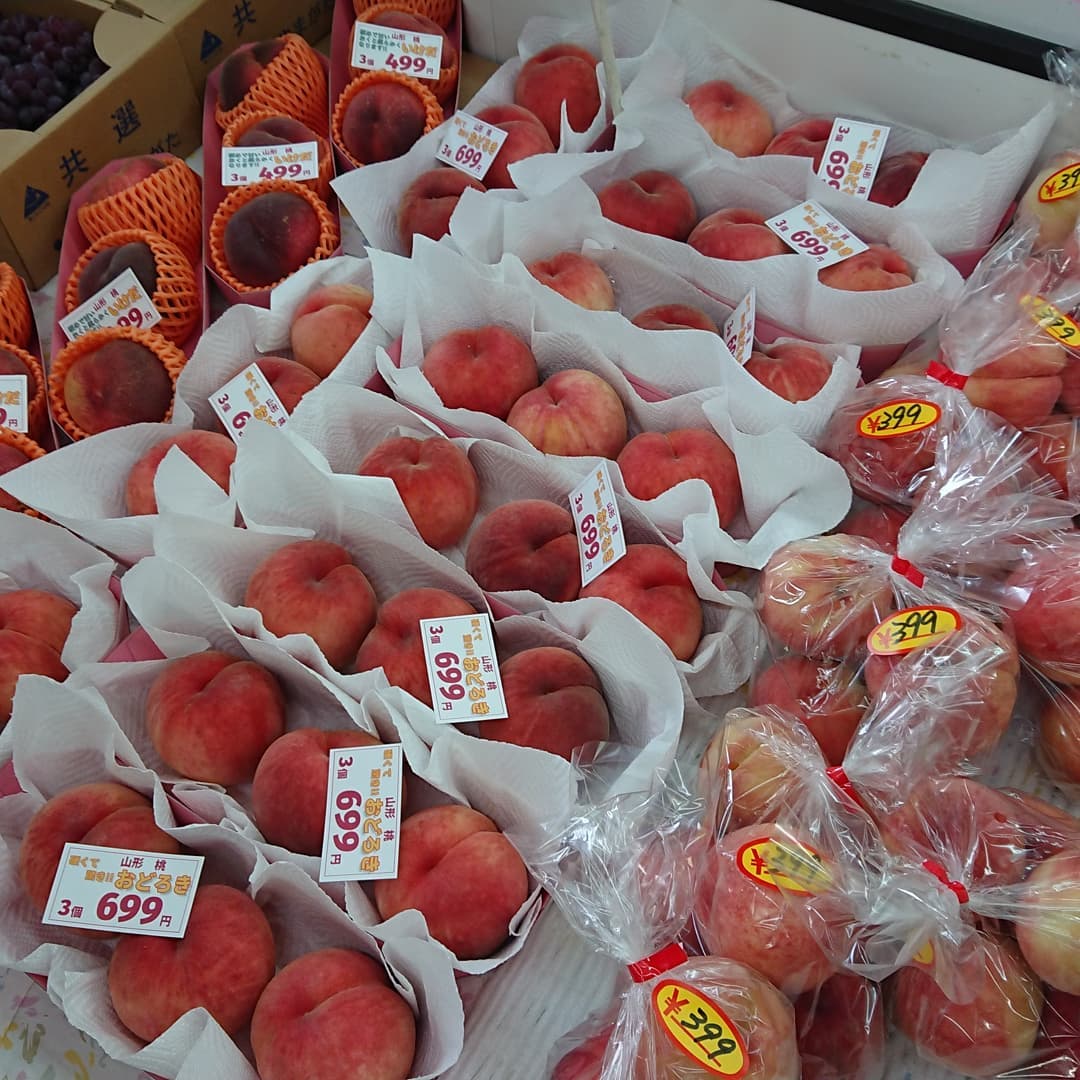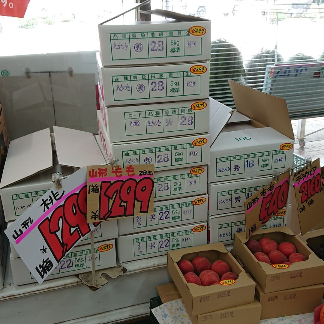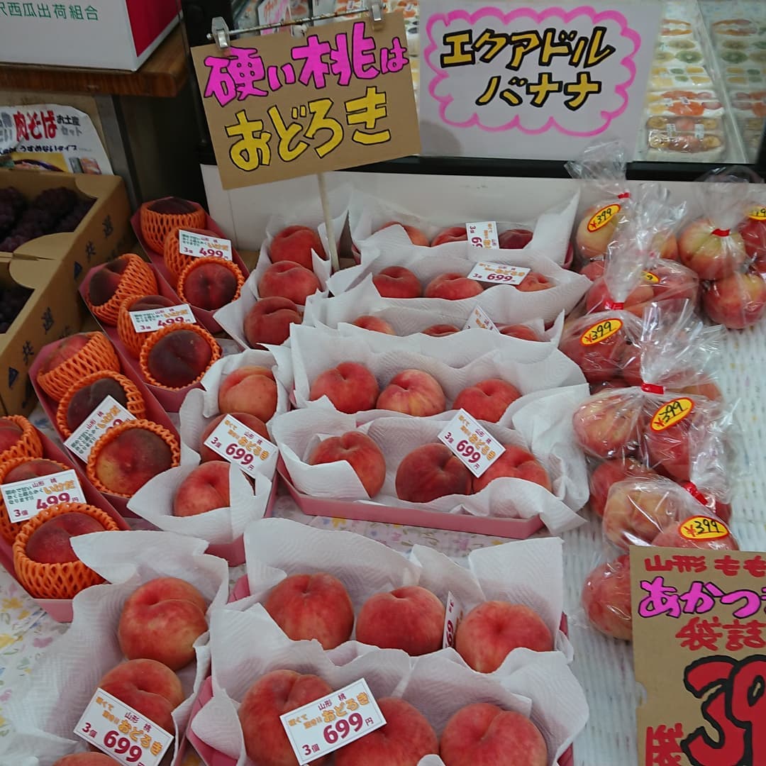 - 山形の桃 【硬い桃】 『おどろき』が初入荷 【幻の桃】 『いけだ』も入荷しました どちらも3個盛りで小分けしました。 【バナナの箱売り】 大房バナナが5房入り13kgで799円 とうもろこし 5本108円 えのき茸5袋108円 アボカド1個59円 キュウリ1kg108円 ほかもいろいろあるよ~️