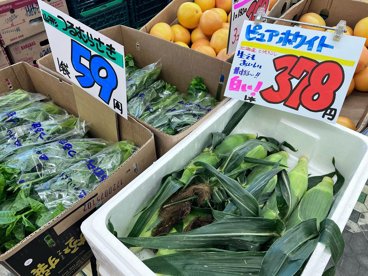 梨が出回ると『秋だ〜』っていう感じがする R13栗子峠を福島側に超えたあたりがこの梨の産地です。 ワンポイントキズ有りなのでご家庭用にどうぞ〜。店内に小分けもあります。 北海道のホワイトピュア️ 生でも食べられるめちゃ甘いとうもろこしその名の通り真っ白いとうもろこしです。
