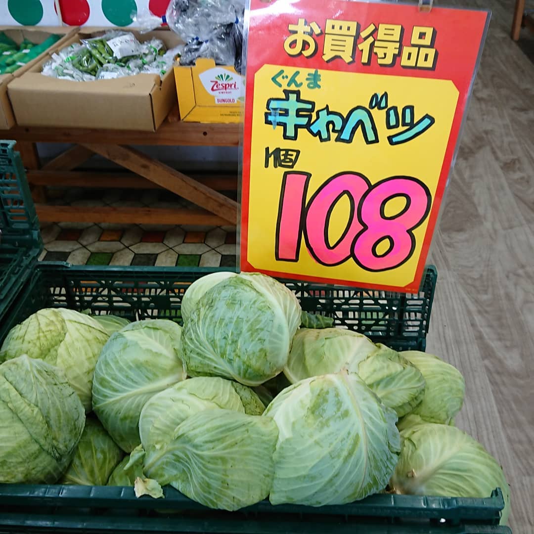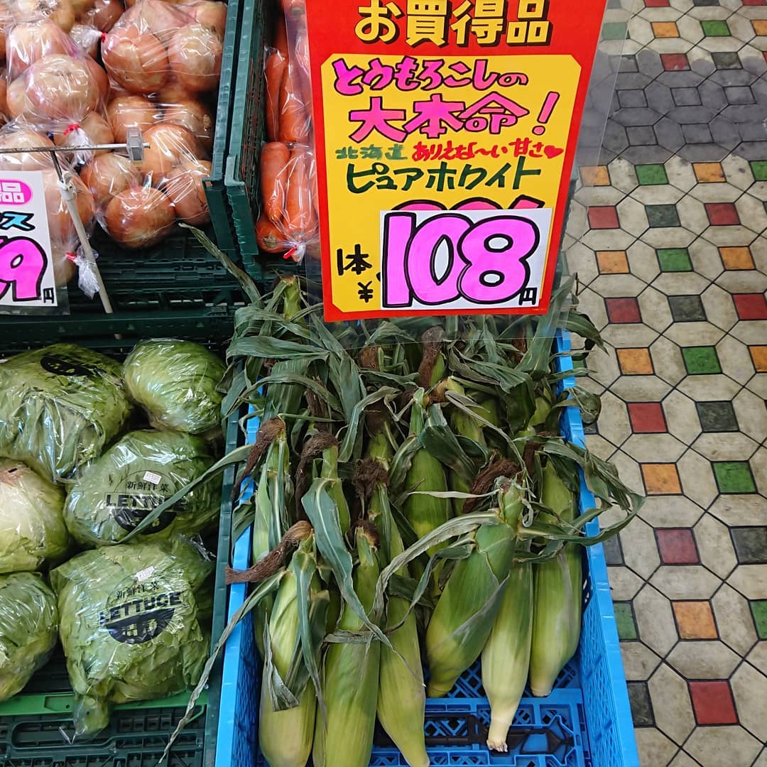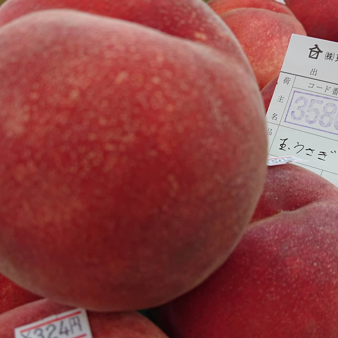 石川産『ルビーロマン』入荷~ さすがにいいお値段️ 白いとうもろこし「ピュアホワイト」108円️ キャベツ108円️ 桃『玉うさぎ』1個324円 きゅうり4本108円️ などなど~️