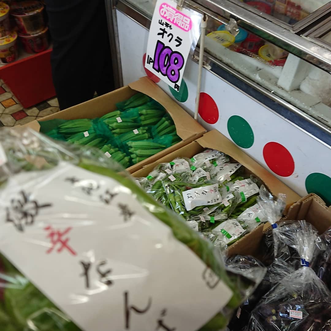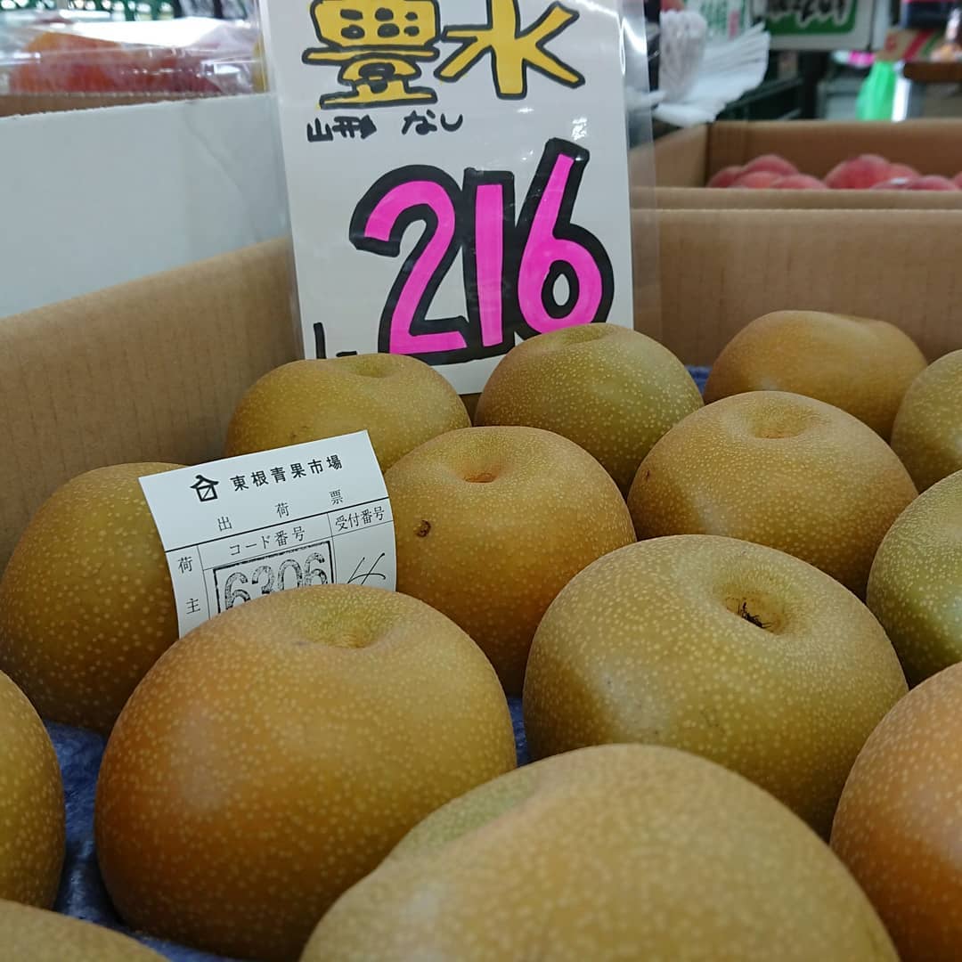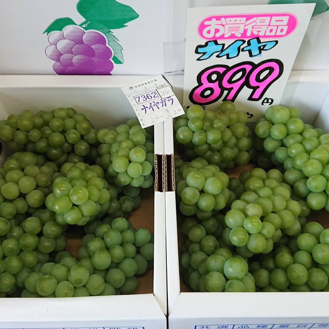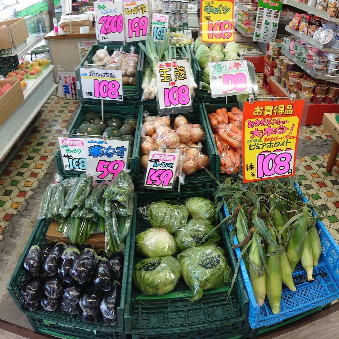 石川産『ルビーロマン』入荷~ さすがにいいお値段️ 白いとうもろこし「ピュアホワイト」108円️ キャベツ108円️ 桃『玉うさぎ』1個324円 きゅうり4本108円️ などなど~️