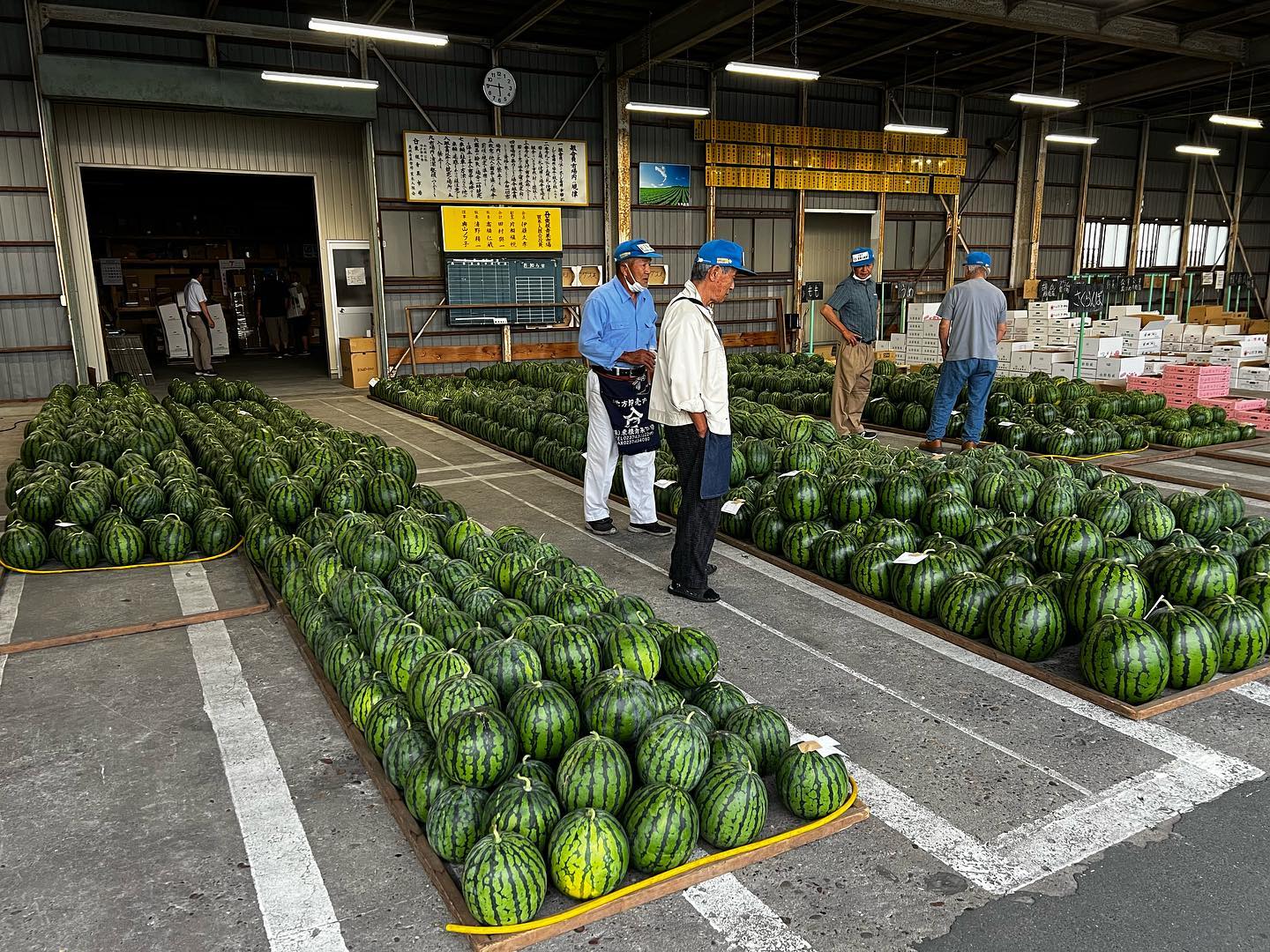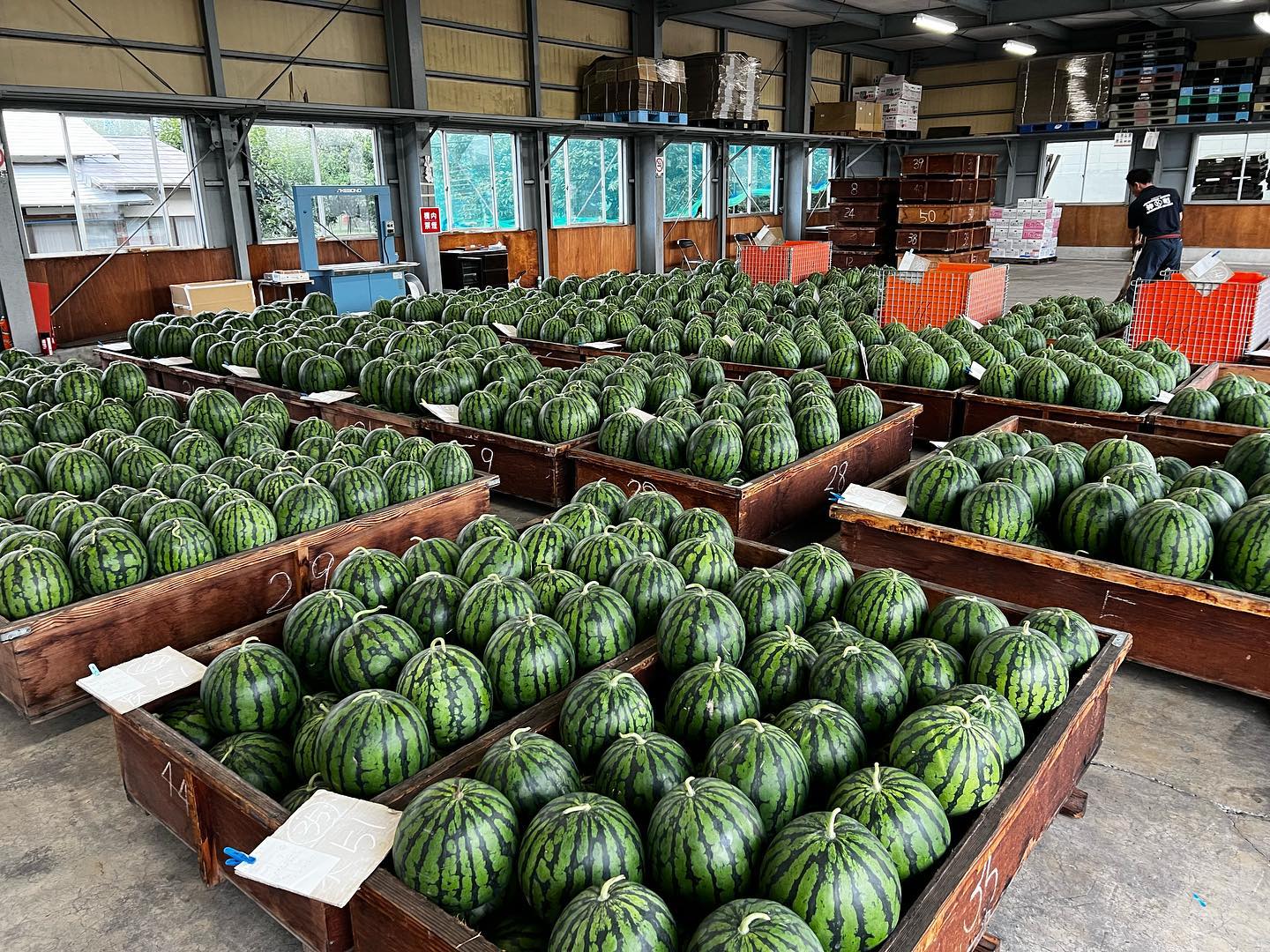 税込ジャスト1,000円️ 尾花沢スイカ『羅皇』入荷〜️ 最後の写真2枚は市場の様子です。