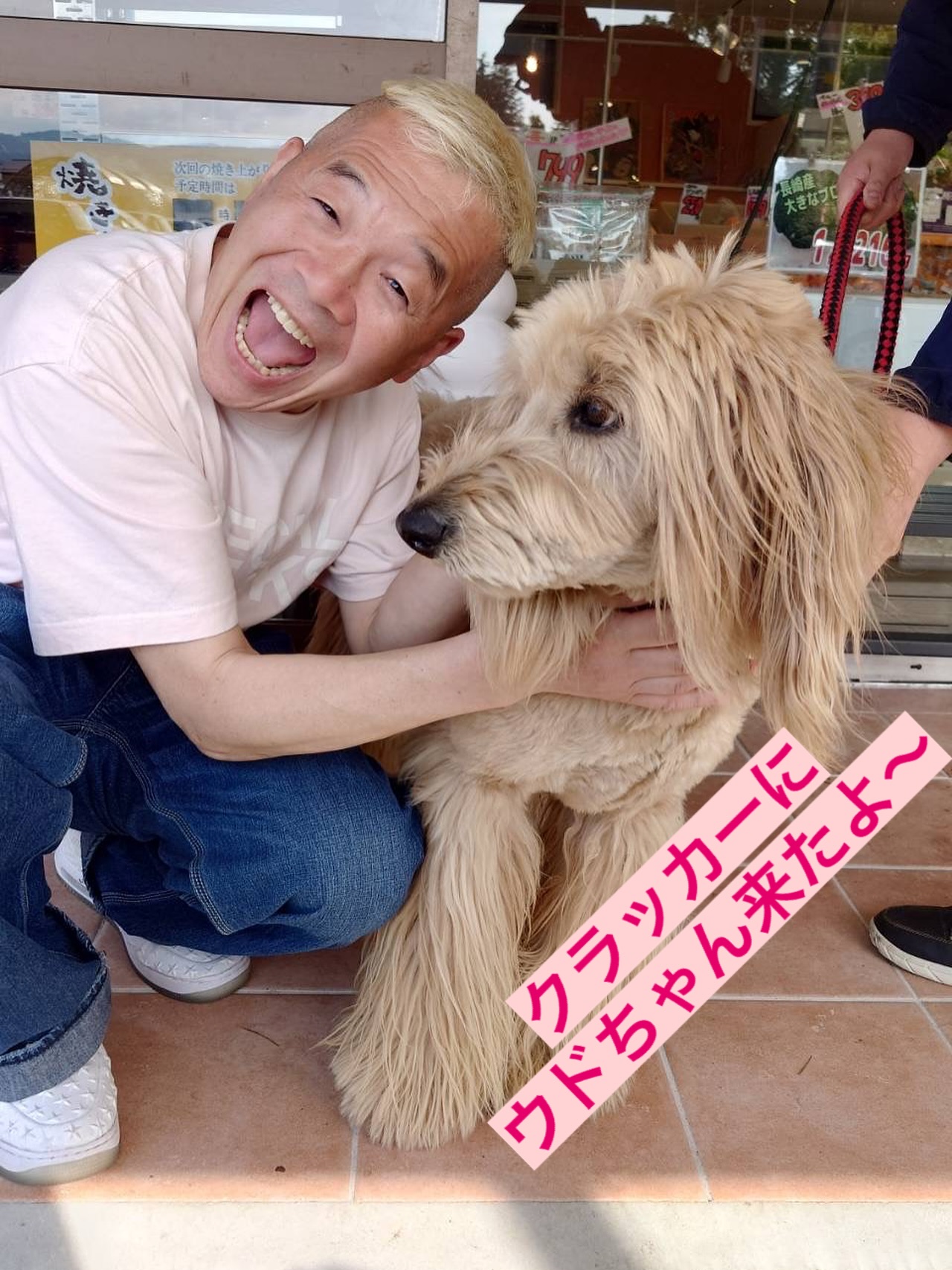 突然、ウドちゃんがご来店️ クラッカーの看板犬『いっぷく』とツーショット