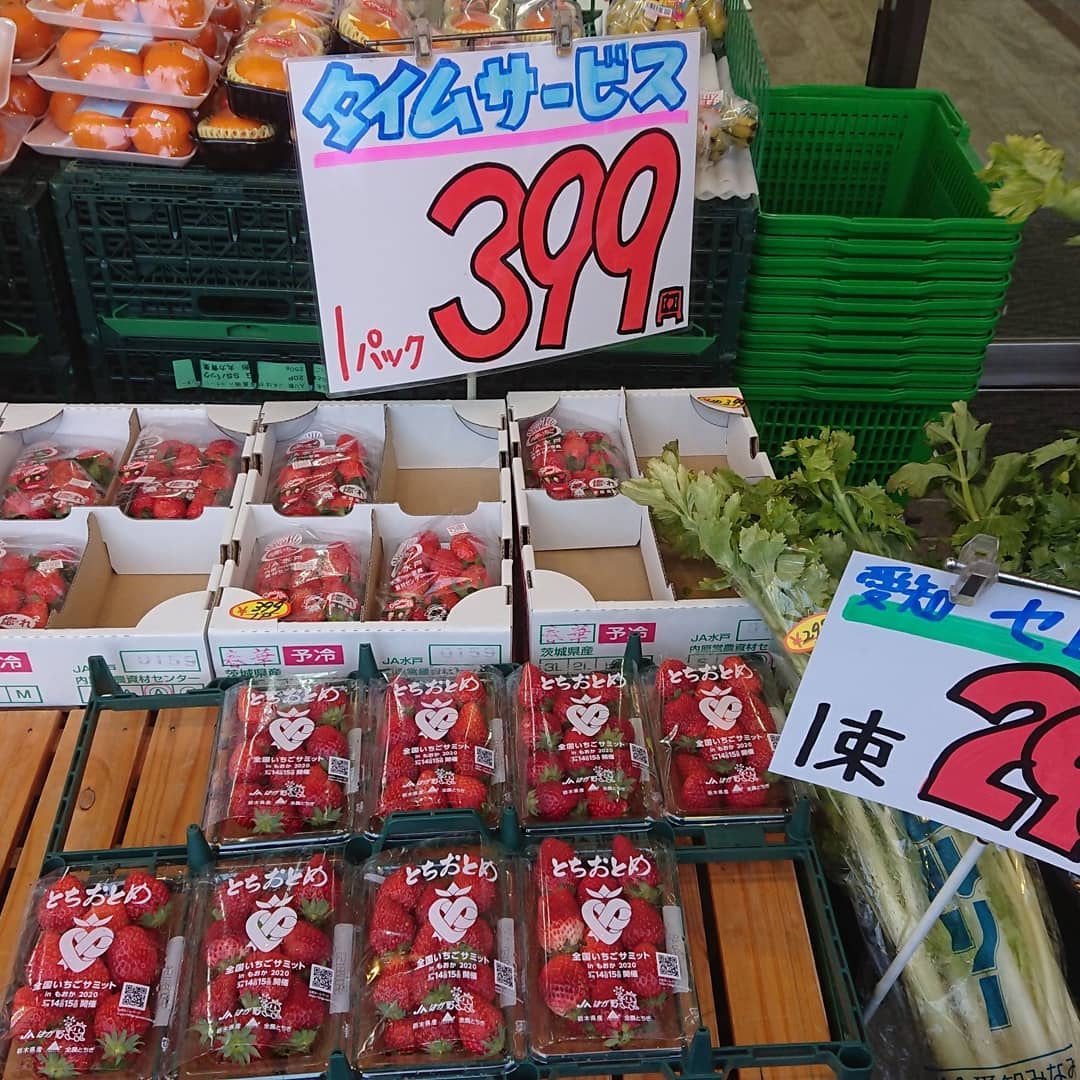 苺 明日は店休日️というわけで、 『苺1P399円』 セロリはこの大束で298円 ≪このキャラ顔デカ️≫チョコバナナはアートだデコシャル️はみんなの笑顔のために~️