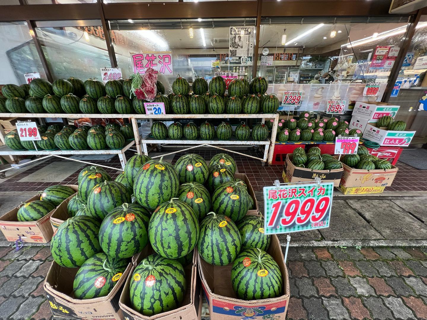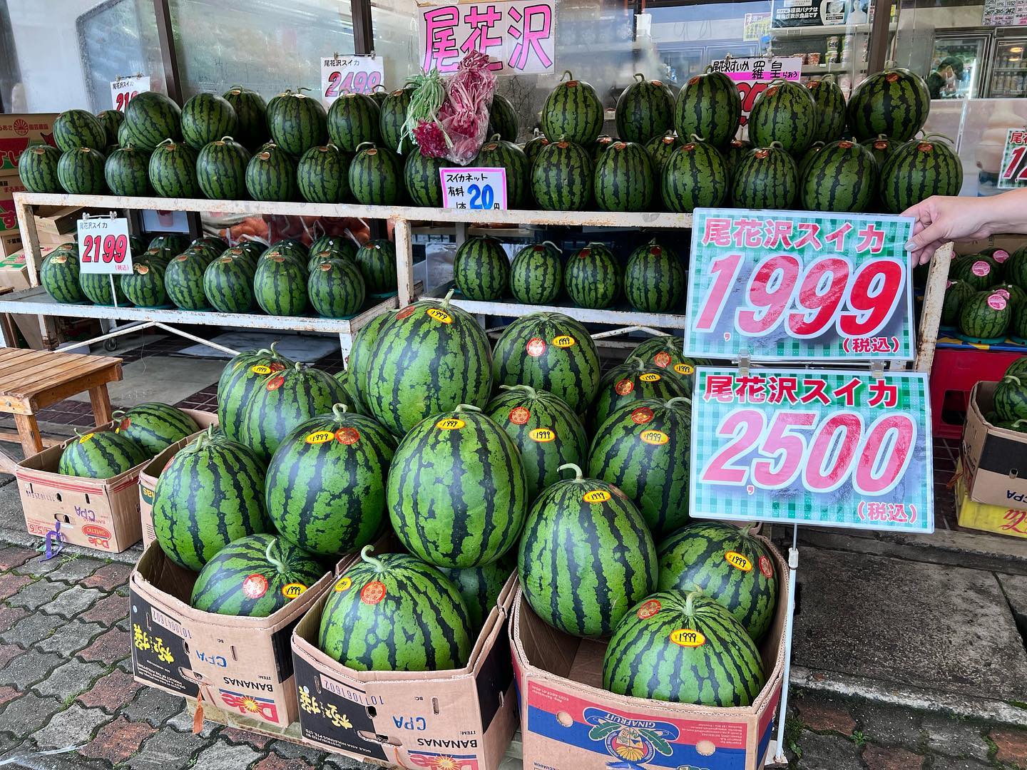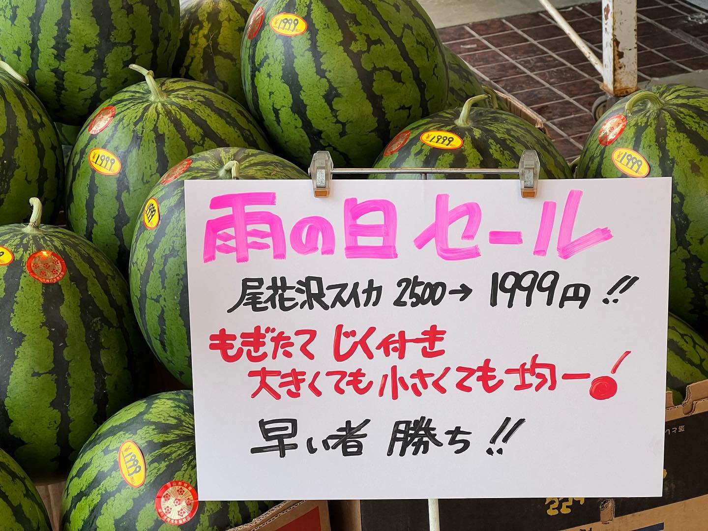 - 雨の日サービス️ 尾花沢スイカセール️ 2,500円を1,999円に雨の日限定セール もぎたて、じくつき、大きくても小さくても1,999円に均一価格️ 本日7/15晴れてきたり現物が売り切れれば終了!(対象は一山だけです) 小玉スイカも充実 799円〜️