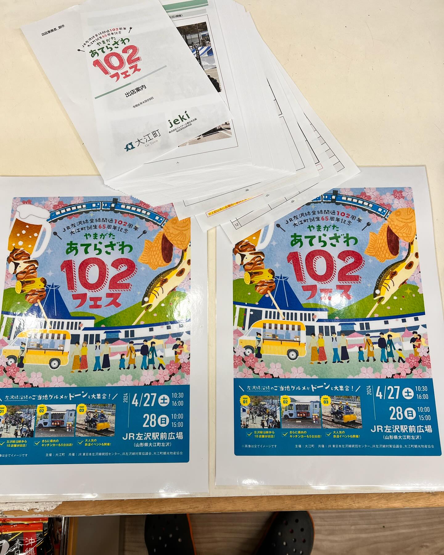 4/27、28 JR左沢駅前広場にて やまがたあてらざわ102フェス なんと出店者向け資料が32ページ️ 主催者の熱意がビリビリと伝わってきます️ 両日ともクラッカーは出張販売します。